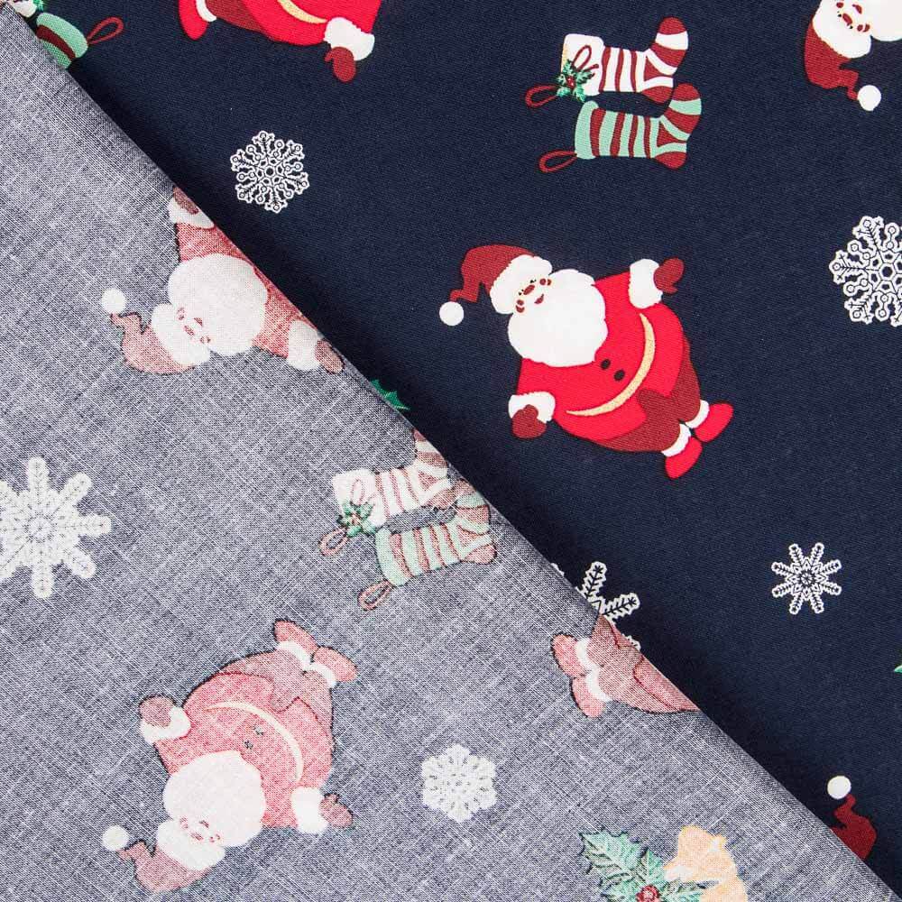 Tissu pour décoration de Noël imprimé Père Noël bleu. La popeline est un tissu de coton très polyvalent, doux, fin et soutenu. Tissu en coton pour les décos de fin d'année, les nappes et le patchwork.