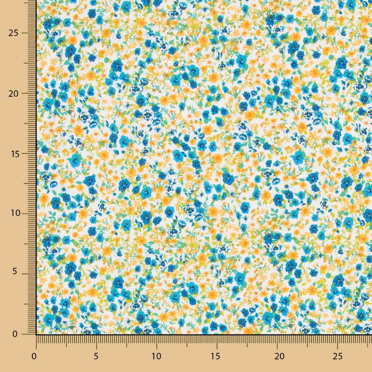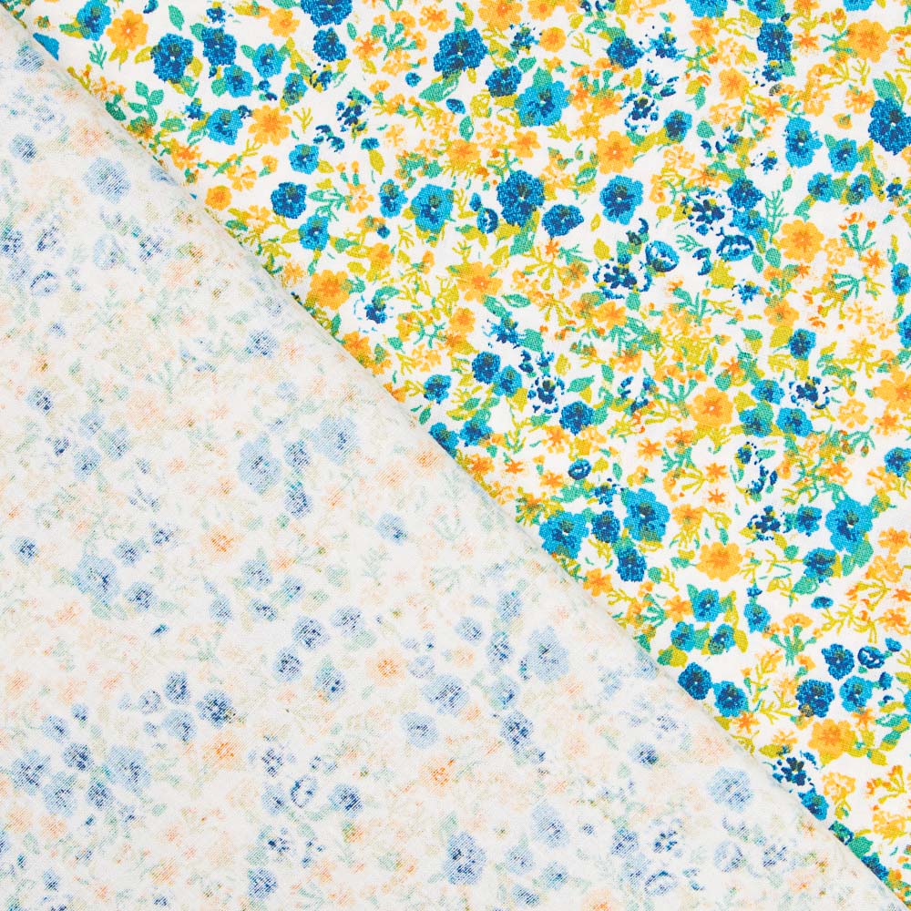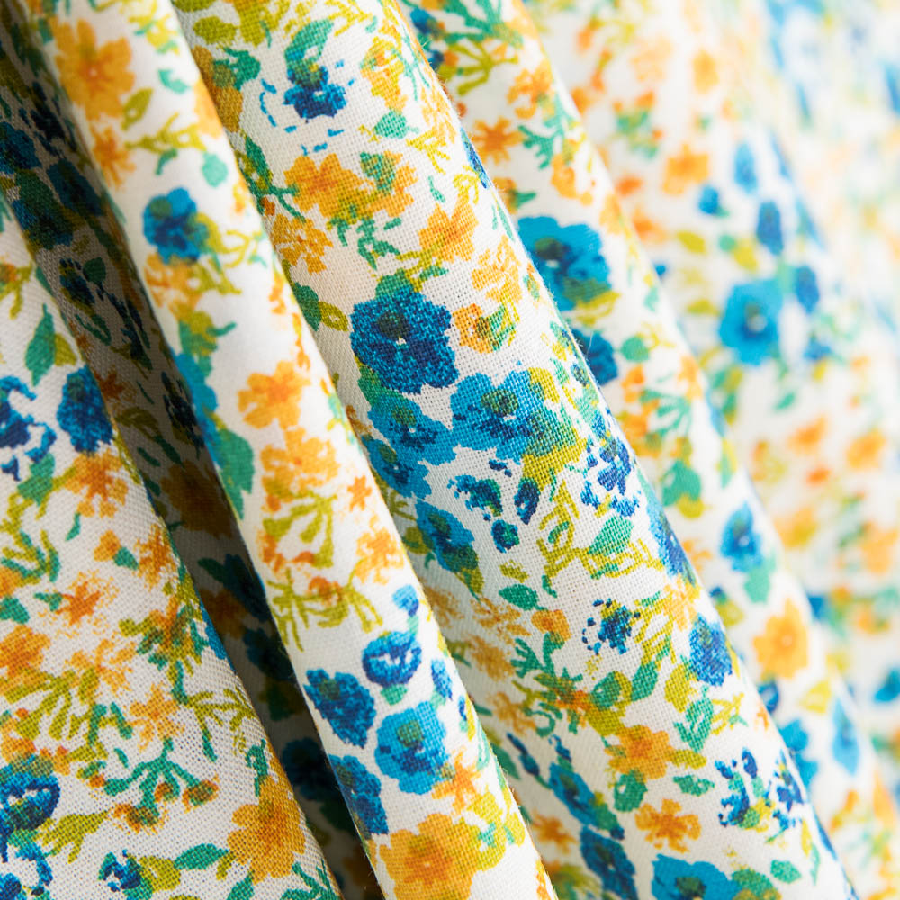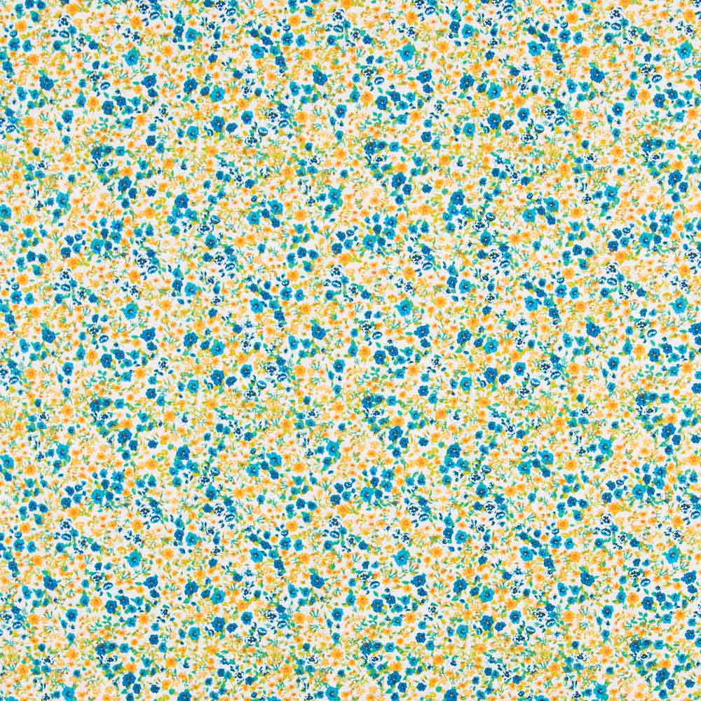 Tissu coton avec de petites fleurs jaunes et vertes. Tissu popeline de coton, très doux, fin et résistant, parfait pour la confection de coussins, draps, patchwork et toutes sortes de décorations. Coton OEKO-TEX.