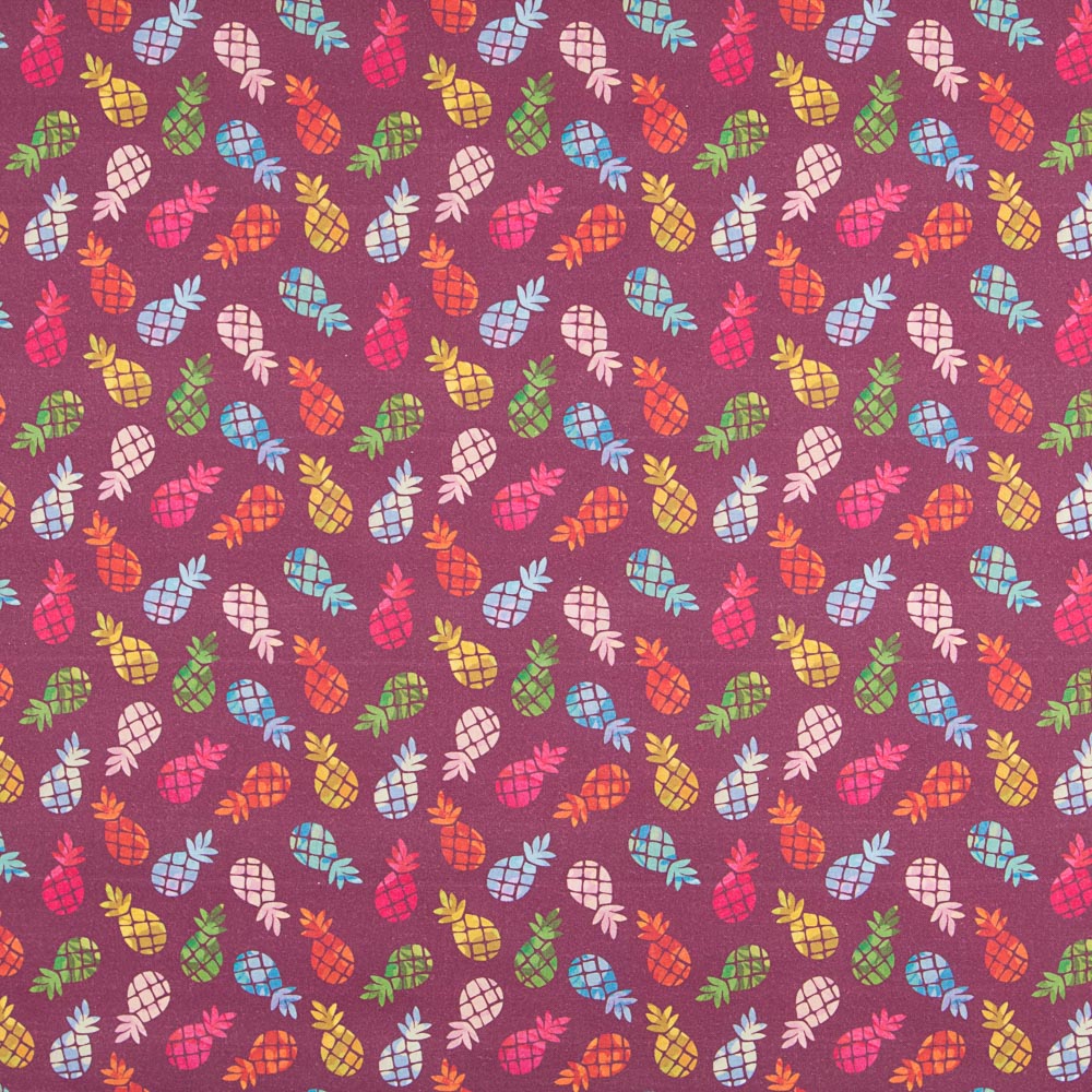Tissu imprimé ananas sur fond grenat. La Popeline est un tissu très versatile, douce, fine et consistante. Tissu de coton idéal pour des accessoires, décoration de la maison, patchwork et aussi des masques.