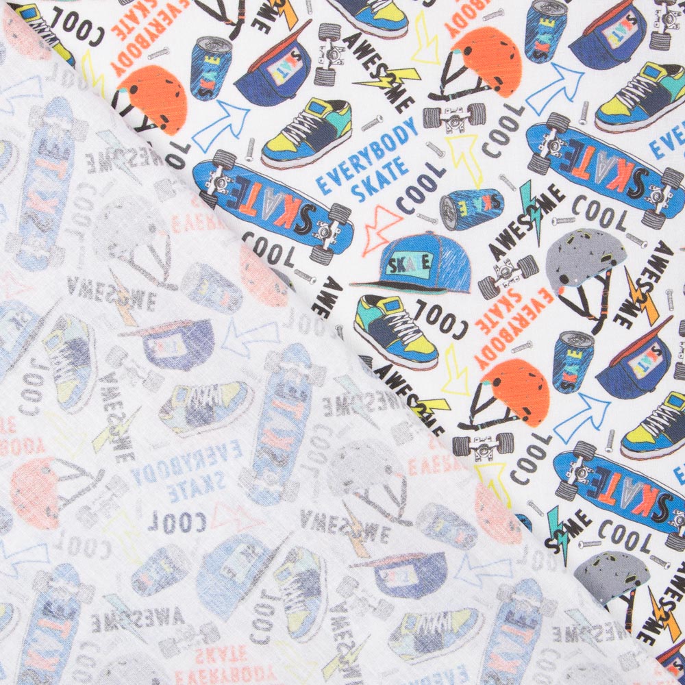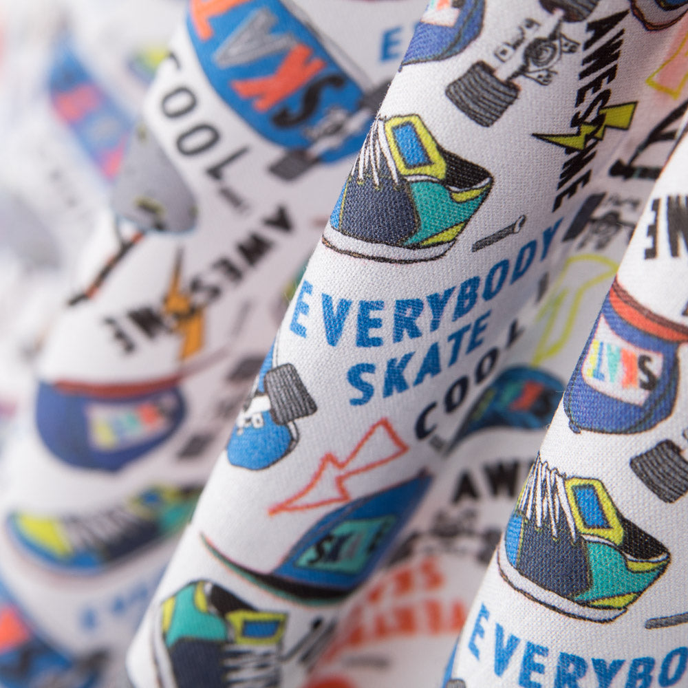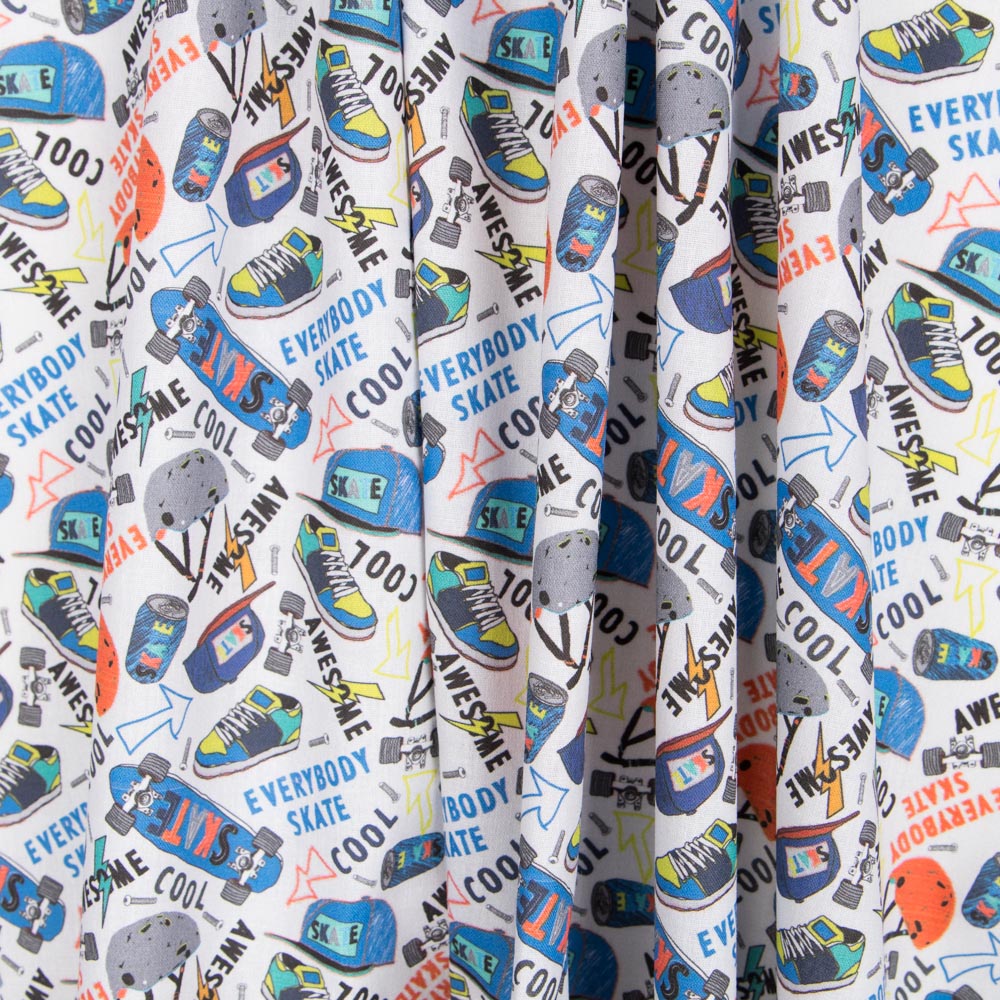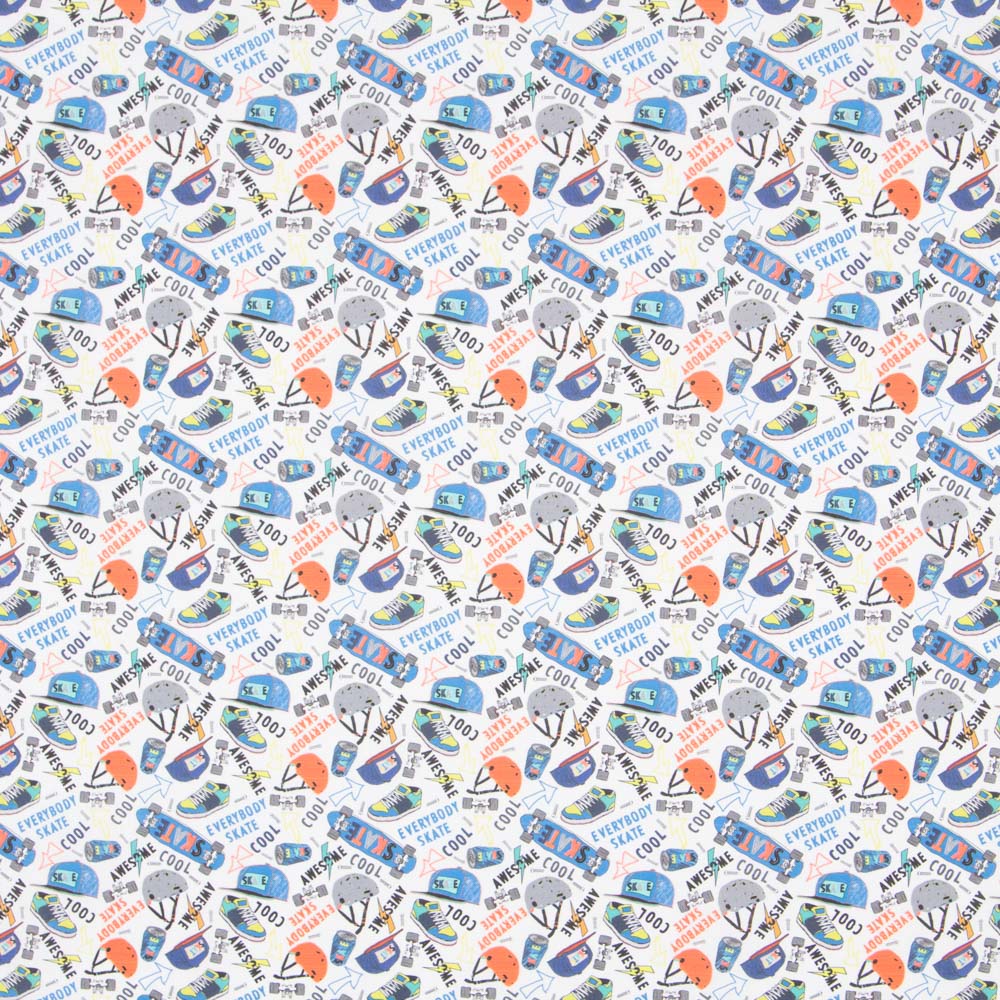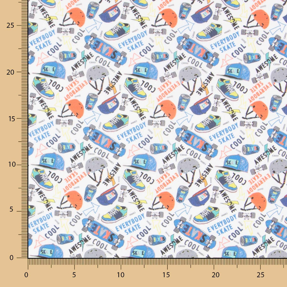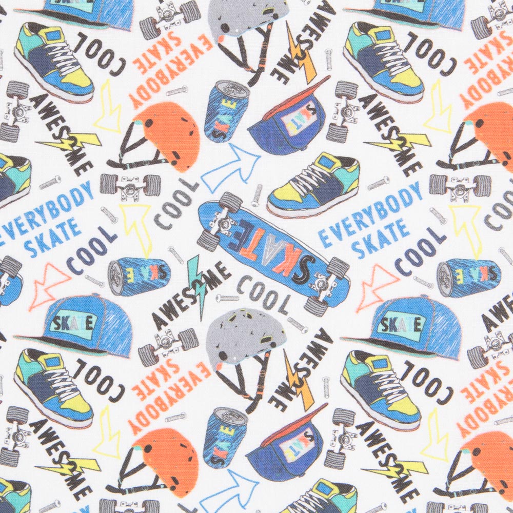 Tissu de coton imprimé de skates sur un fond blanc original. La popeline est un tissu de coton très polyvalent, doux, fin et soutenu. Tissu de coton idéal pour les accessoires, la décoration , le patchwork et les masques.
