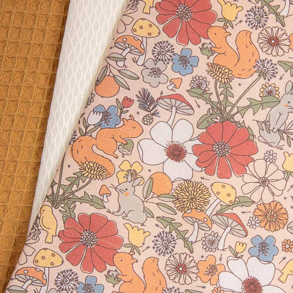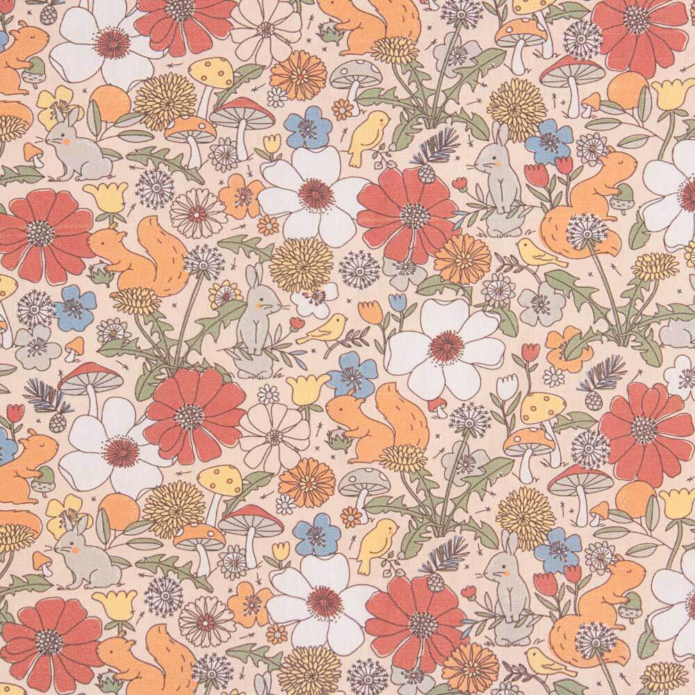 Tissu en popeline de coton imprimé de motifs floraux et animaliers en couleurs sur une base rose saumon. La popeline de coton est un tissu très doux, fin et polyvalent, très doux et polyvalent. La popeline est un tissu de base parfait pour coudre des coussins, du linge de lit, du patchwork et toutes sortes de décorations.