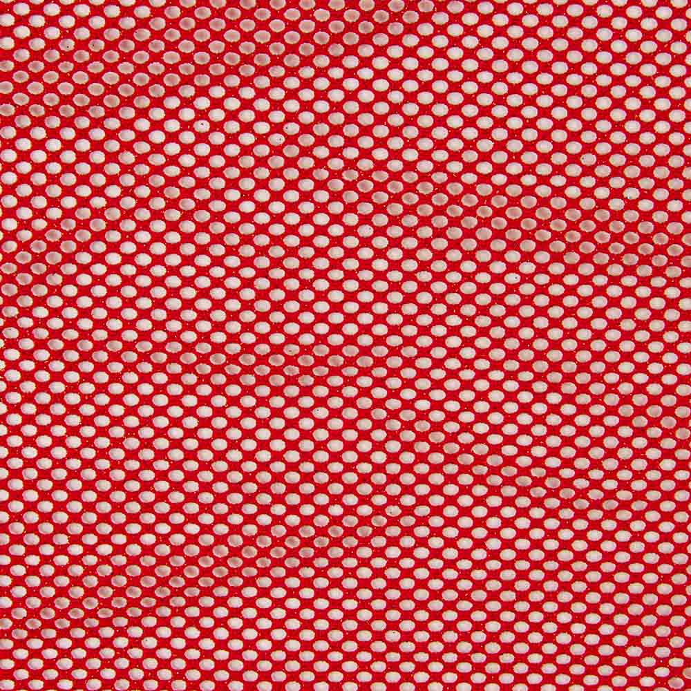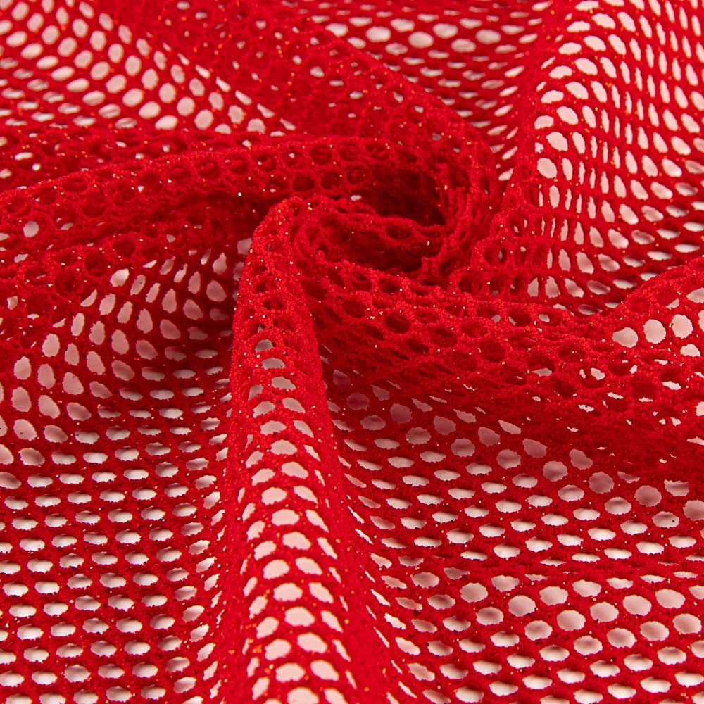 Tissu à larges mailles ajourées de couleur rouge avec des paillettes de la même couleur. La largeur du filet est de 3 mm. C'est un tissu synthétique qui cède et s'étire mais sans élasthanne dans la composition, simplement en raison de la structure du tissu. Tissu en maille avec drapé, résistant et visuellement frappant. Tissu filet légèrement élastique pour la confection de vêtements de sport ou comme complément aux vêtements de sport, aux costumes et à la mode fantaisie. Tissu utilisé pour les décorations en raison de sa polyvalence, simulant des filets et créant des transparences.