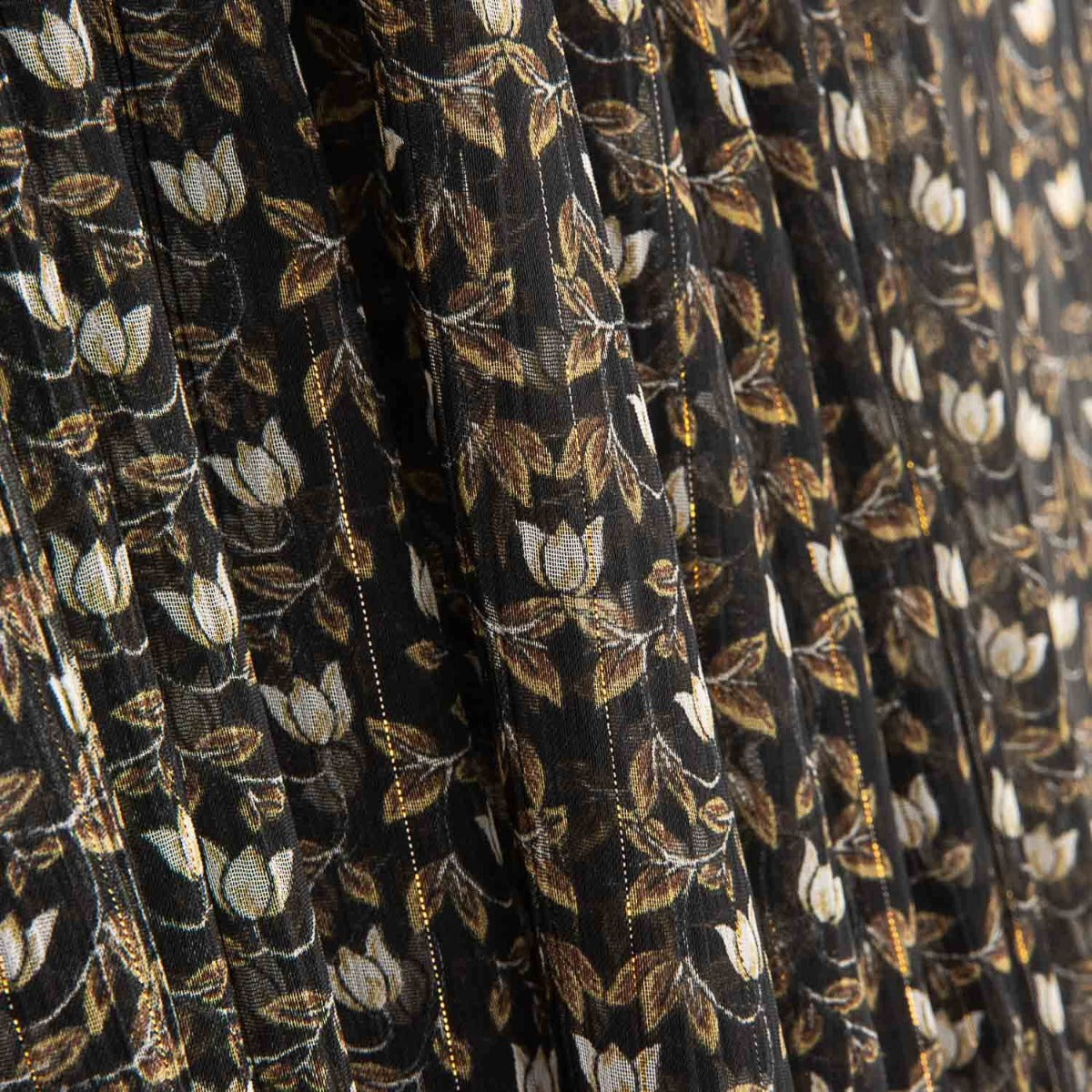 Esta tela de gasa 100% poliéster, con un ancho de 150 cm, presenta un delicado estampado de pequeñas flores en tonos beige y marrón sobre un fondo oscuro, creando un diseño elegante y atemporal.