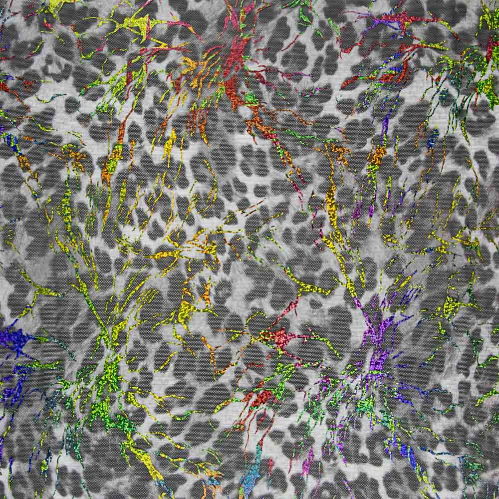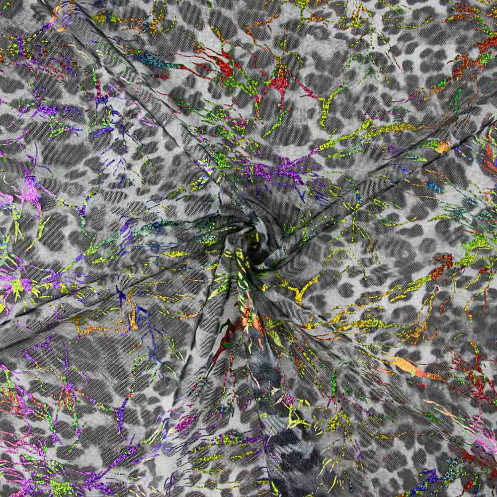 Tissu en maille élastique avec un imprimé animalier noir sur fond gris. Sur le dessus de l'imprimé se trouve un motif holographique laminé multicolore qui dégage de magnifiques scintillements arc-en-ciel sous forme de motifs filigranes. Tulle à armure ouverte, élastique dans les deux sens. S'élastique sans craquage du laminé, avec un très bon retour de tissu, s'adaptant parfaitement aux vêtements les plus serrés. Tulle élastique translucide, avec peu de corps, très drapé et léger. Tulle lycra ajouré, idéal pour les maillots, les costumes et les vêtements qui nécessitent un ajustement total au corps.