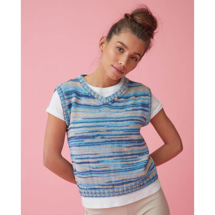 Pelote de la collection Festival de Pingouin, fil de coton multicolore avec de légers éclats. Fil idéal pour tricoter une variété de vêtements pour le printemps, robes, tops, accessoires. Disponible dans différentes couleurs. Pelote de 50 grammes et +/- 135 mètres. Achetez 9 pelotes pour tricoter un pull taille 42, 6 pelotes pour tricoter un pull taille 6. Patron : 22 mailles x 27 rangs sur les 4 aiguilles. Composition : 95% coton, 3% polyamide, 2% polyester.
