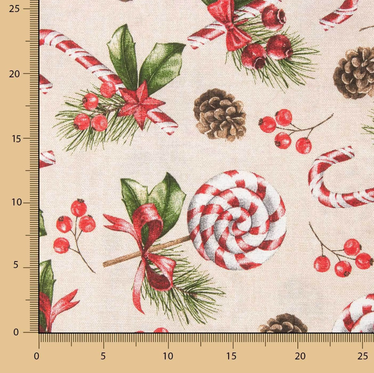 Con un encantador estampado de piñas, ramas de pino, hojas de acebo, bastones de caramelo y piruletas decoradas con lazos rojos, esta tela sobre fondo beige rústico es ideal para crear una atmósfera cálida y festiva en tu hogar.
