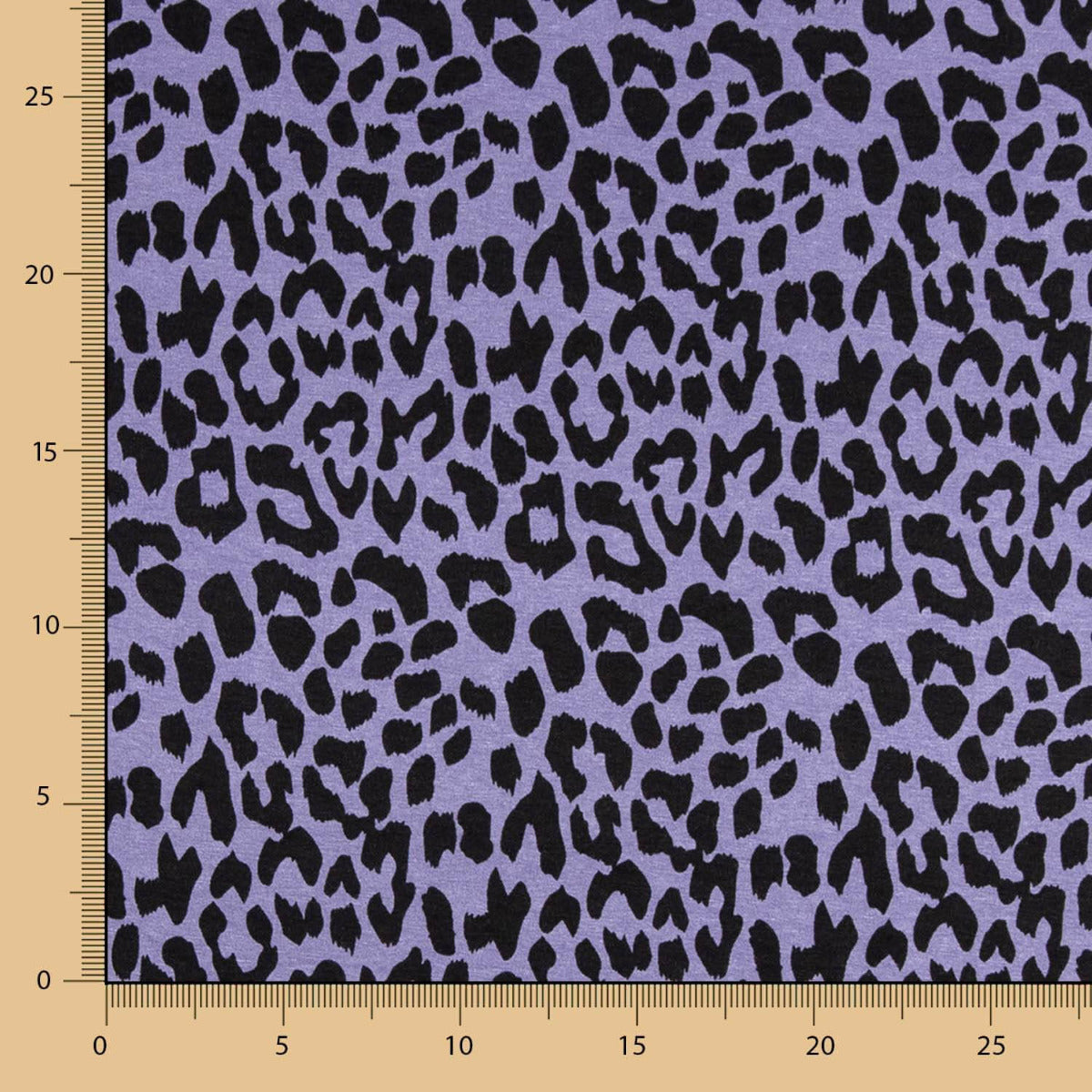 Maille tricot Jersey en viscose avec imprimé animalier en taches noires sur fond violet. Tissu très doux, drapé et épais. Il contient un pourcentage d'élasthanne qui apporte élasticité, confort et aisance aux vêtements confectionnés. Parfait pour coudre des pulls tricotés, des vestes, des ponchos et tout type de vêtements.