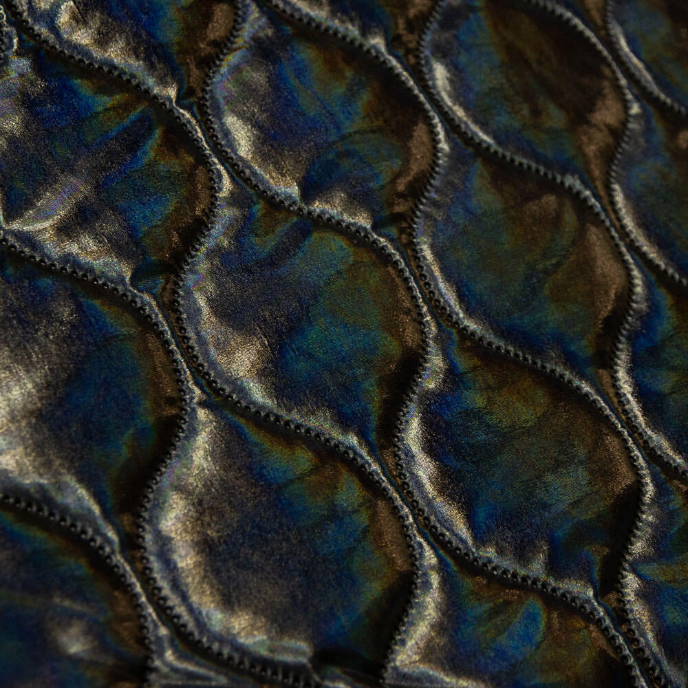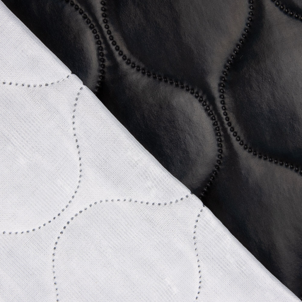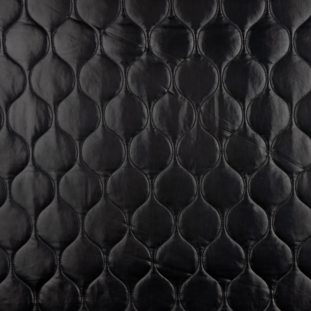 Acolchada de polipiel para chaquetas negra en dibujo geométrico. Tela polipiel en relieve y cierto acolchado, totalmente opaca, muy suave y con cuerpo, aportando volumen y calor a las prendas confeccionadas. La tela contiene polipiel por una cara y forro a juego por la otra.