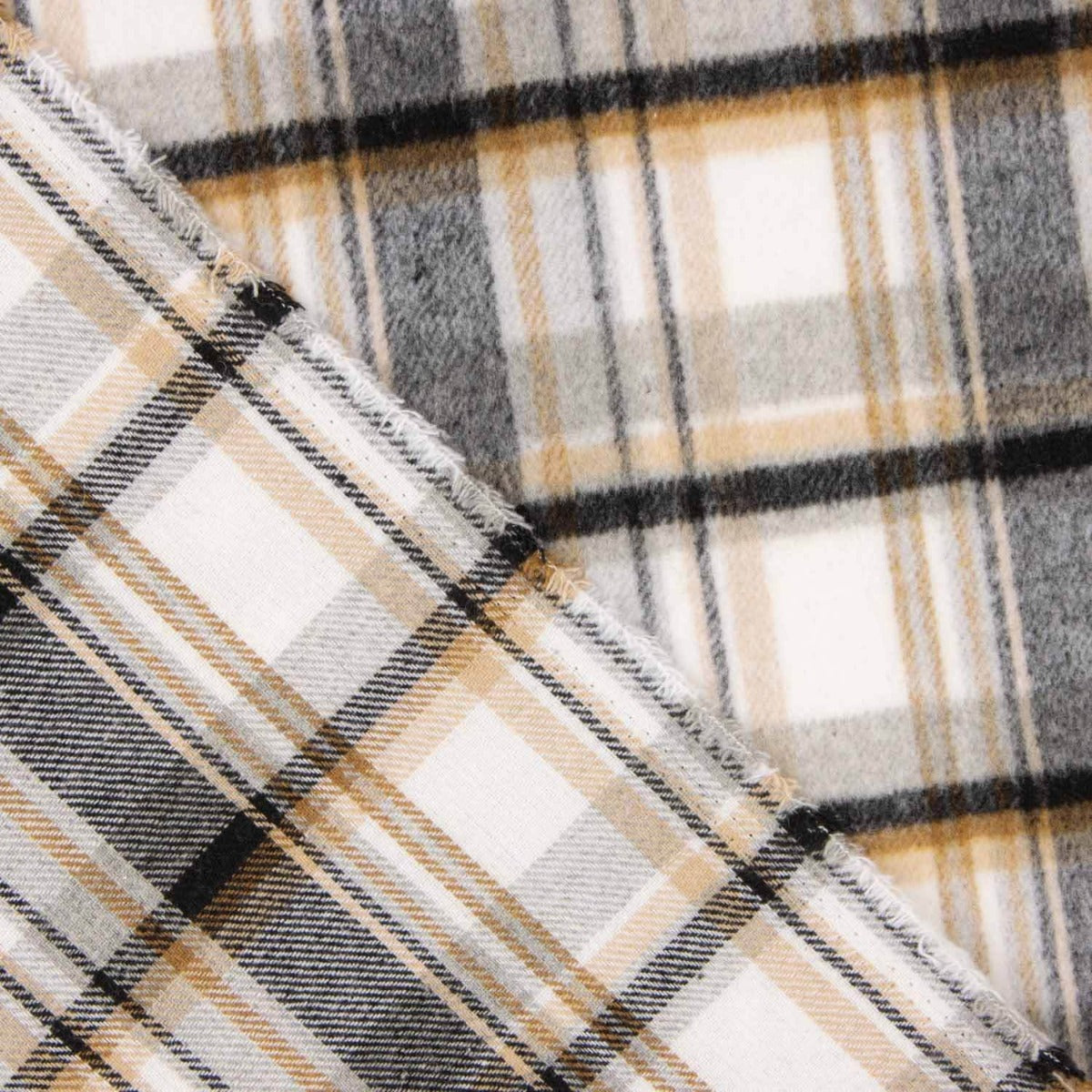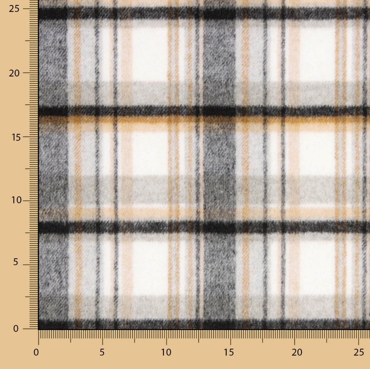 Tissu Mouflon avec un motif à carreaux de style tartan dans des tons blanc cassé, gris perle, noir et moutarde doux. Une palette épurée et moderne qui ajoute une touche de chaleur visuelle sans être trop envahissante. Composé d'un mélange de 40 % de polyester, 40 % d'acrylique et 20 % de laine, ce tissu de 150 cm de large est idéal pour créer des vêtements d'hiver élégants et polyvalents. Le mouflon est chaud, doux au toucher et a une bonne tenue, ce qui le rend idéal pour confectionner des vestes, des manteaux, des capes, des surchemises, des ponchos ou des accessoires de décoration intérieure. Son design, aux lignes bien définies mais subtiles, s'intègre parfaitement aux styles scandinave, urbain ou classique revisité. Grâce à sa composition synthétique, il est facile à coudre, durable et nécessite peu d'entretien. C'est un choix pratique qui ne fait aucun compromis sur le confort ou le style.
