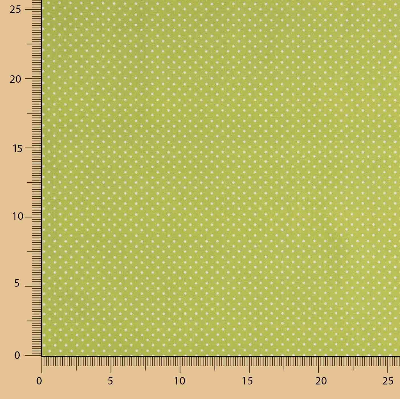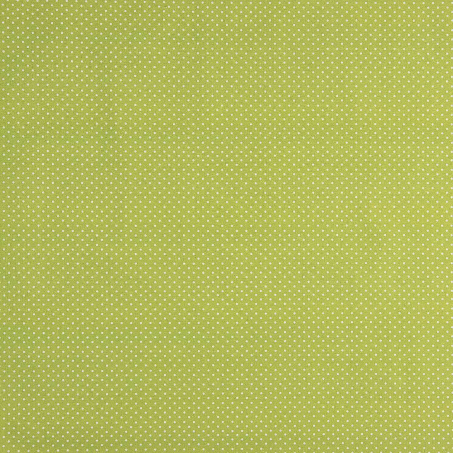 Composition : 100 % coton | Qualité : Percal 200 fils | Largeur : 140 cm | Impression : Numérique haute définition | Motif : Fond pistache à micro-pois blancs | Utilisations : Draps, housses de couette, chemises, robes, chemisiers, coussins et décoration
