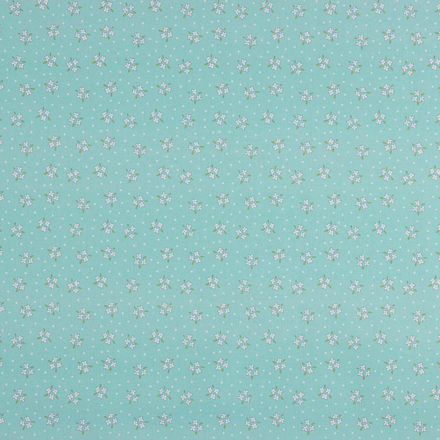 Composition : 100 % coton | Qualité : Percal 200 fils | Largeur : 140 cm | Impression : Numérique haute définition | Motif : Bouquets blancs à micro-pois sur fond vert aqua | Utilisations : Draps, housses de couette, chemises, robes, chemisiers, coussins et décoration