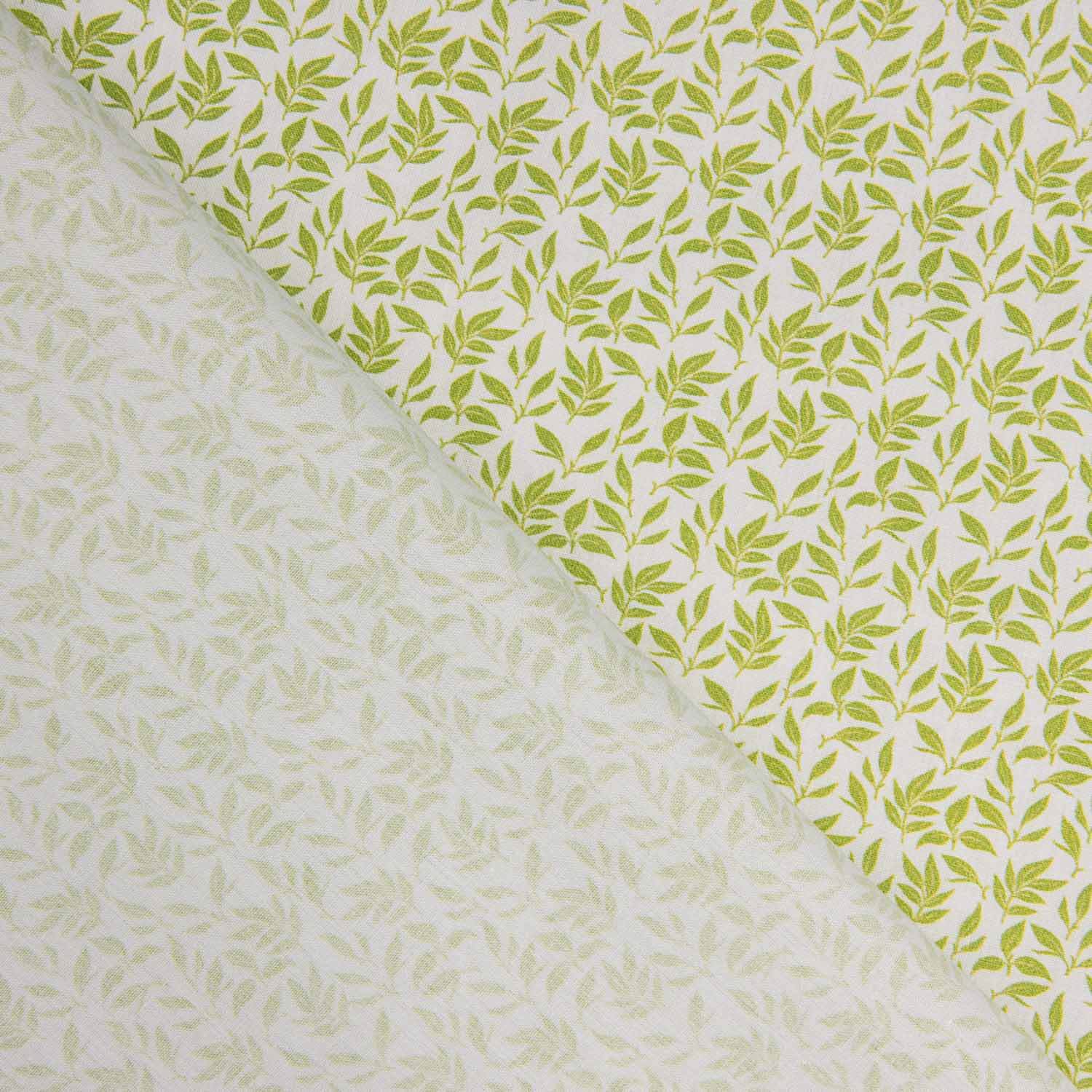 Percal imprimé bouquet pistache confectionné en 100 % coton et tissé en percal 200 fils, qui offre douceur, fraîcheur et excellente résistance. Il présente un délicat imprimé numérique de petites feuilles et bouquets dans des tons pistache sur fond clair, créant un design frais, naturel et intemporel.