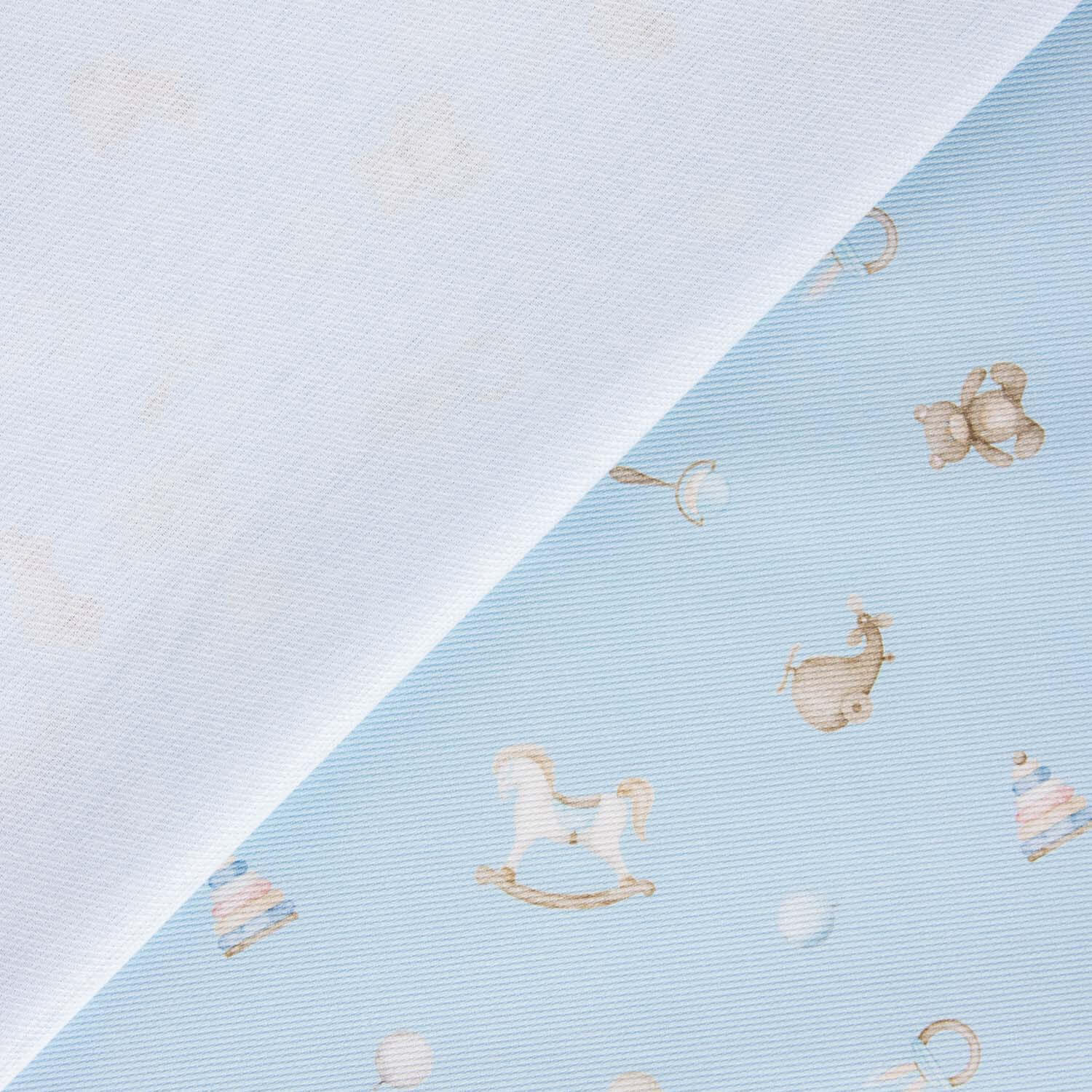 Tissu piqué 100 % coton avec un ravissant imprimé de petits jouets pour bébés dans des tons beige et bleu pâle sur fond bleu ciel. Le tissu piqué se caractérise par sa texture légèrement en relief, fraîche, respirante et épaisse, idéale pour les vêtements confortables et structurés. Son design doux et délicat est parfait pour la confection de vêtements pour enfants, la mode bébé et les accessoires pour nouveau-nés. Idéal pour la confection de robes, chemises, grenouillères, ensembles pour bébés, doudounes, langes, coussins pour enfants et accessoires. Composition : 100 % coton | Largeur : 150 cm | Type de tissu : Piqué | Imprimé : Jouets pour bébés bleu ciel | Utilisation : Mode enfantine et confection.