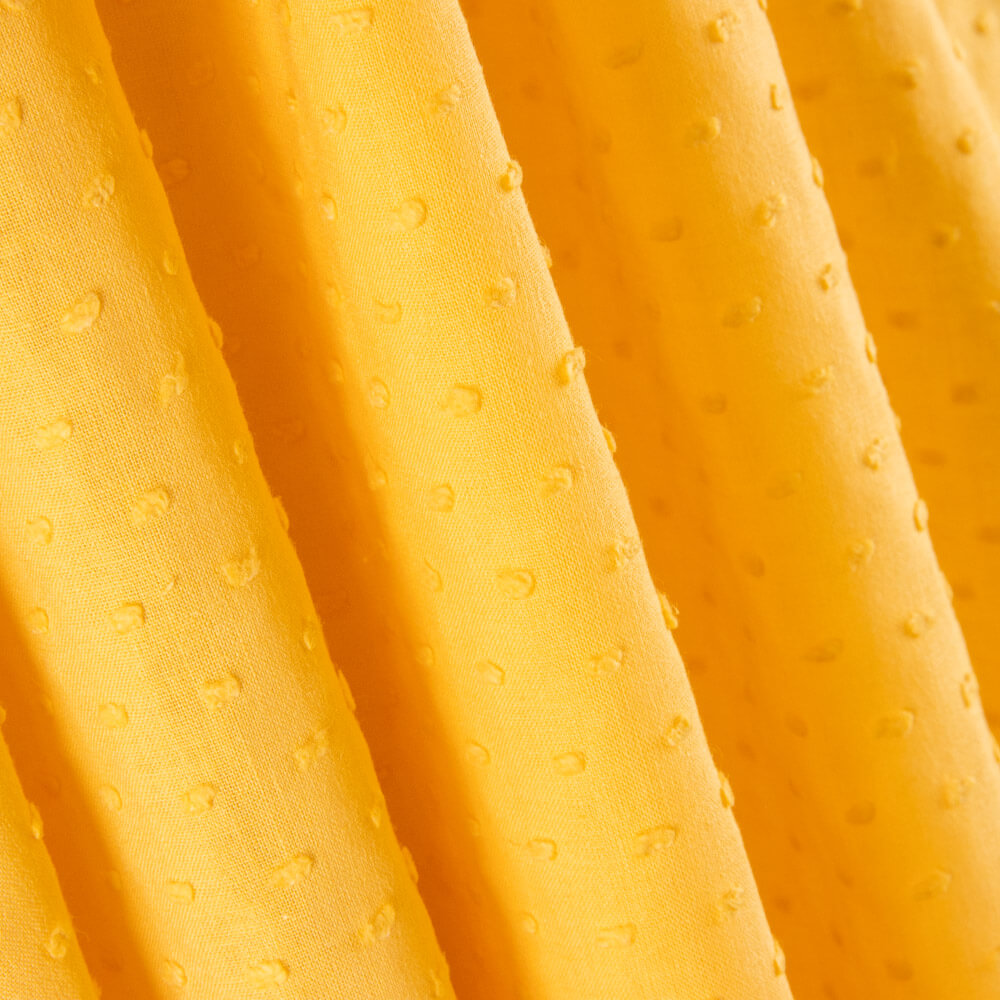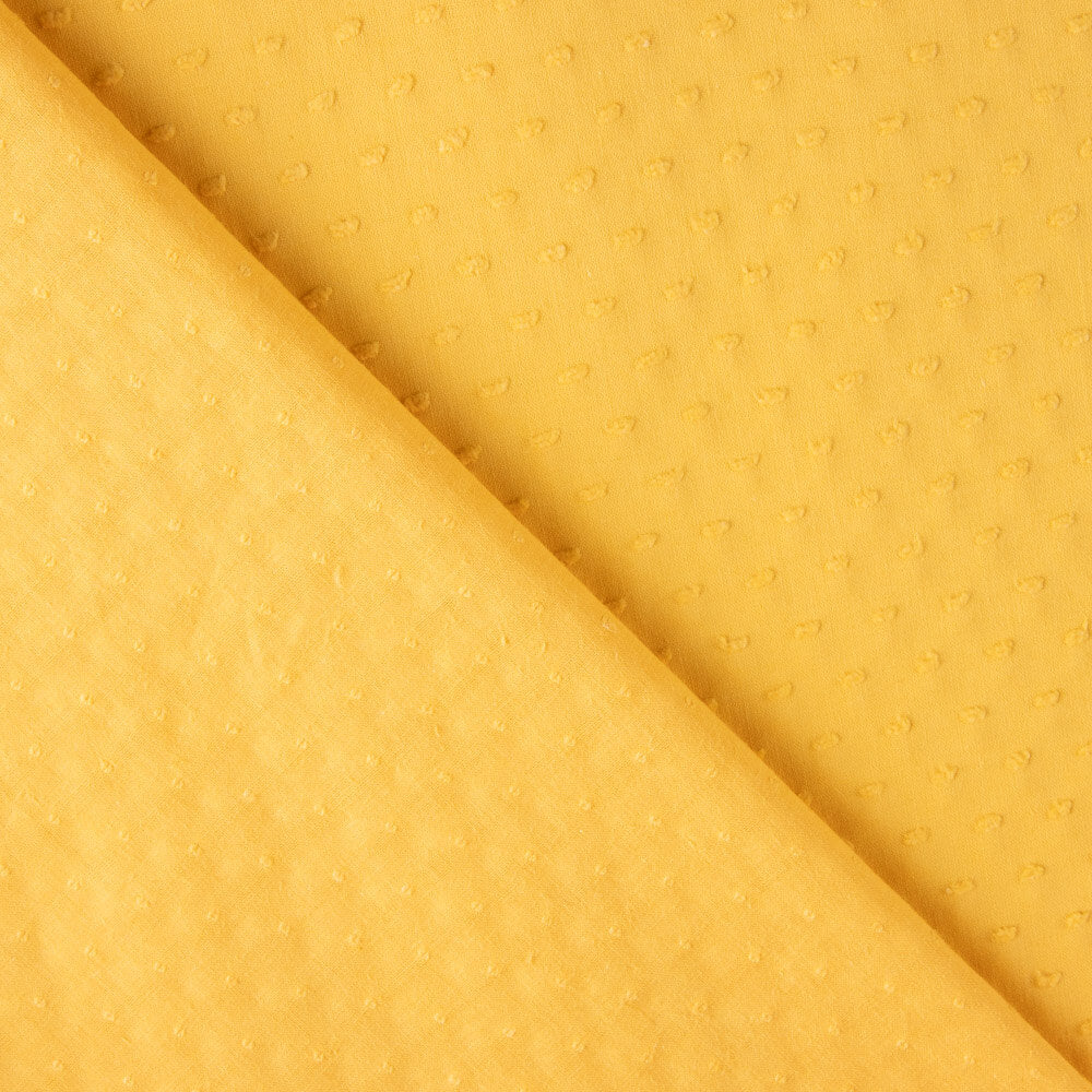 Tela de plumeti color amarillo en algodón de gran calidad y muy versátil. El plumeti es una tela de algodón con un pequeño lunar bordado, sostenido, fino y fluido. Algodón plumeti con el que puedes confeccionar vestidos, faldas y camisas.