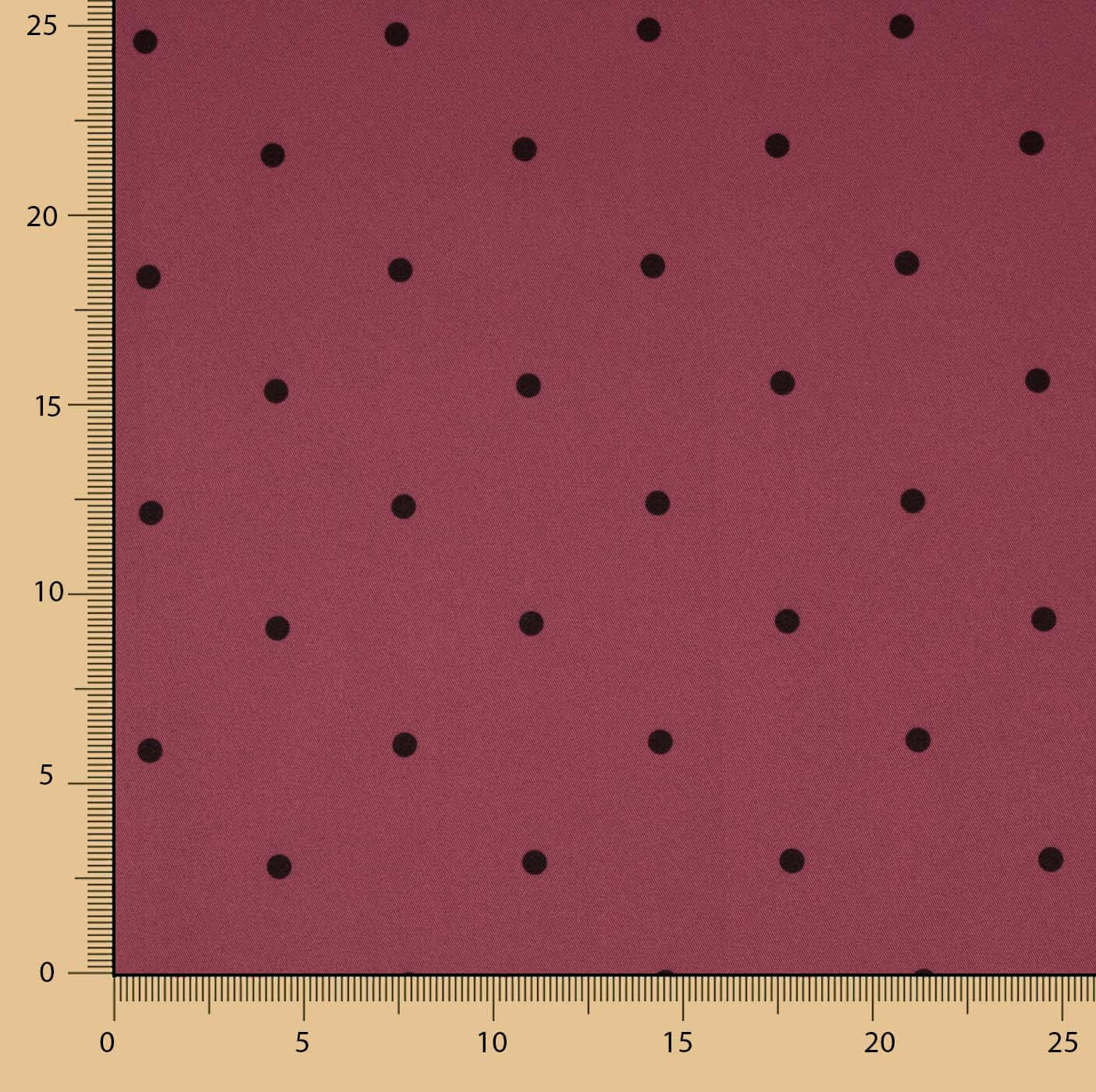 Composition : 97 % polyester – 3 % élasthanne | Largeur : 150 cm | Élasticité : horizontale et légèrement verticale | Motif : pois noirs de 7 mm sur fond grenat | Collection : Flamenca Ribes y Casals