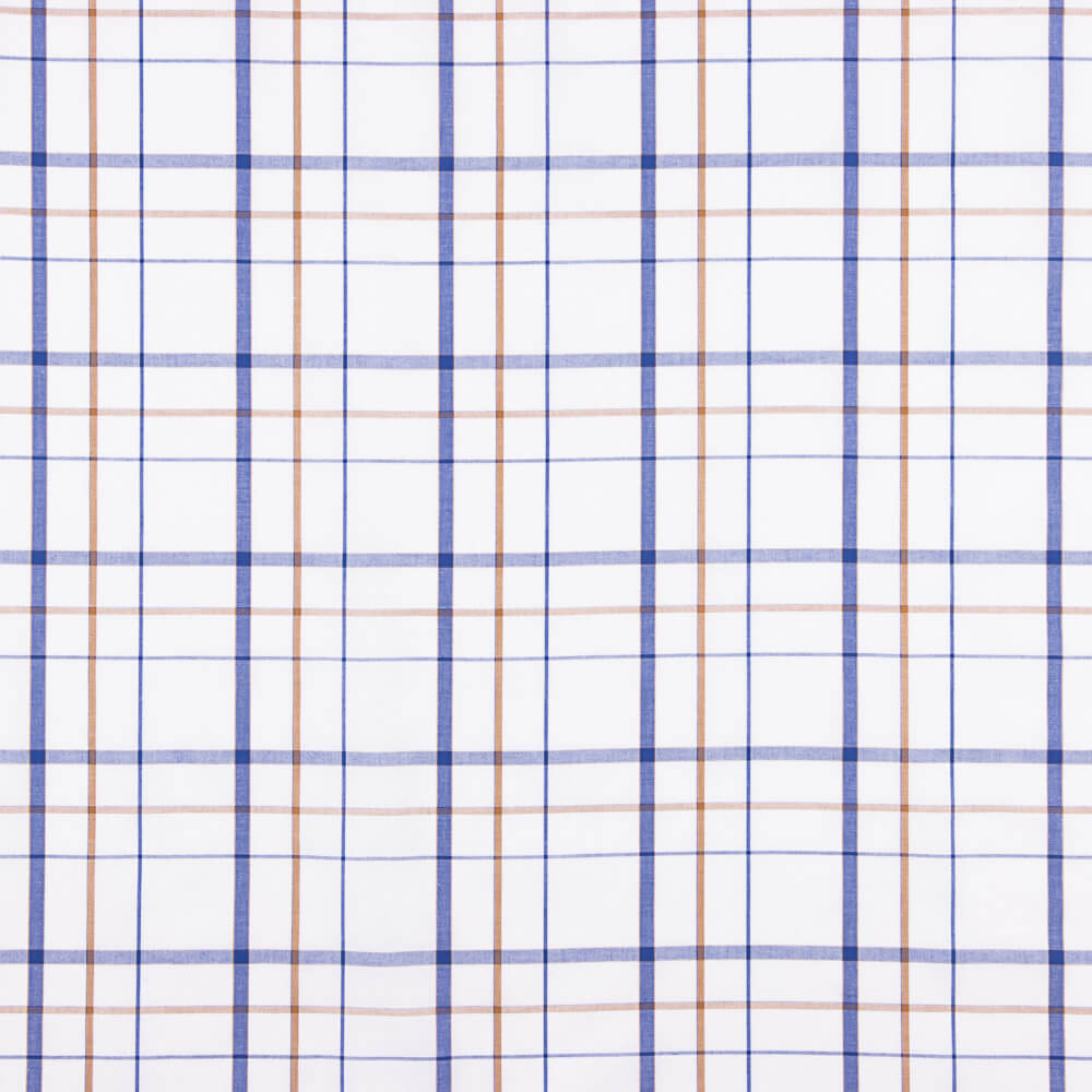 Tela de popelín de algodón para camisería en dibujo rayado marrón y azul formando cuadros sobre base de fondo blanca.