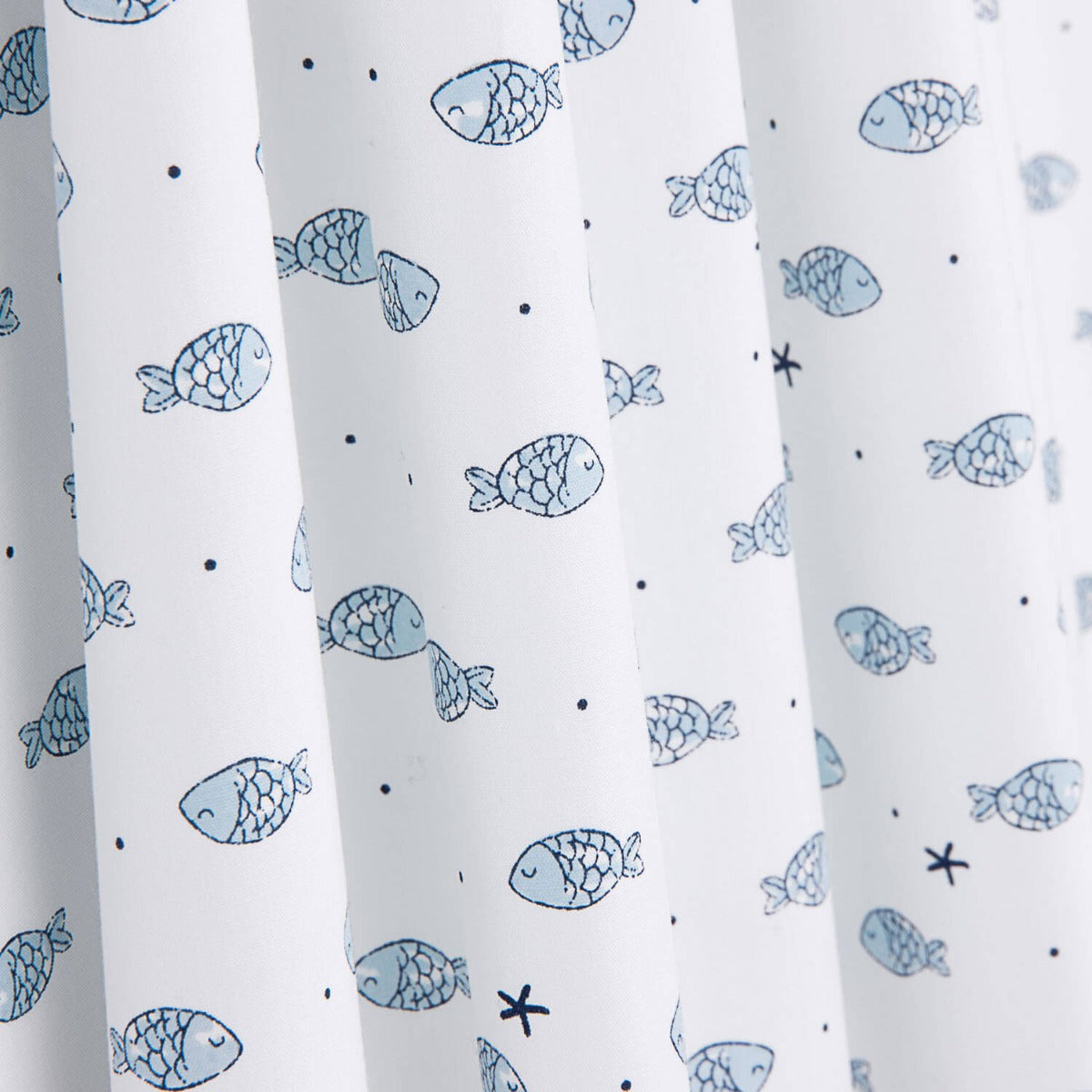 Sumérgete en un mundo de creatividad con esta tela de popelín de algodón orgánico, decorada con un divertido estampado de pequeños peces y estrellas de mar en tonos azul sobre fondo blanco.