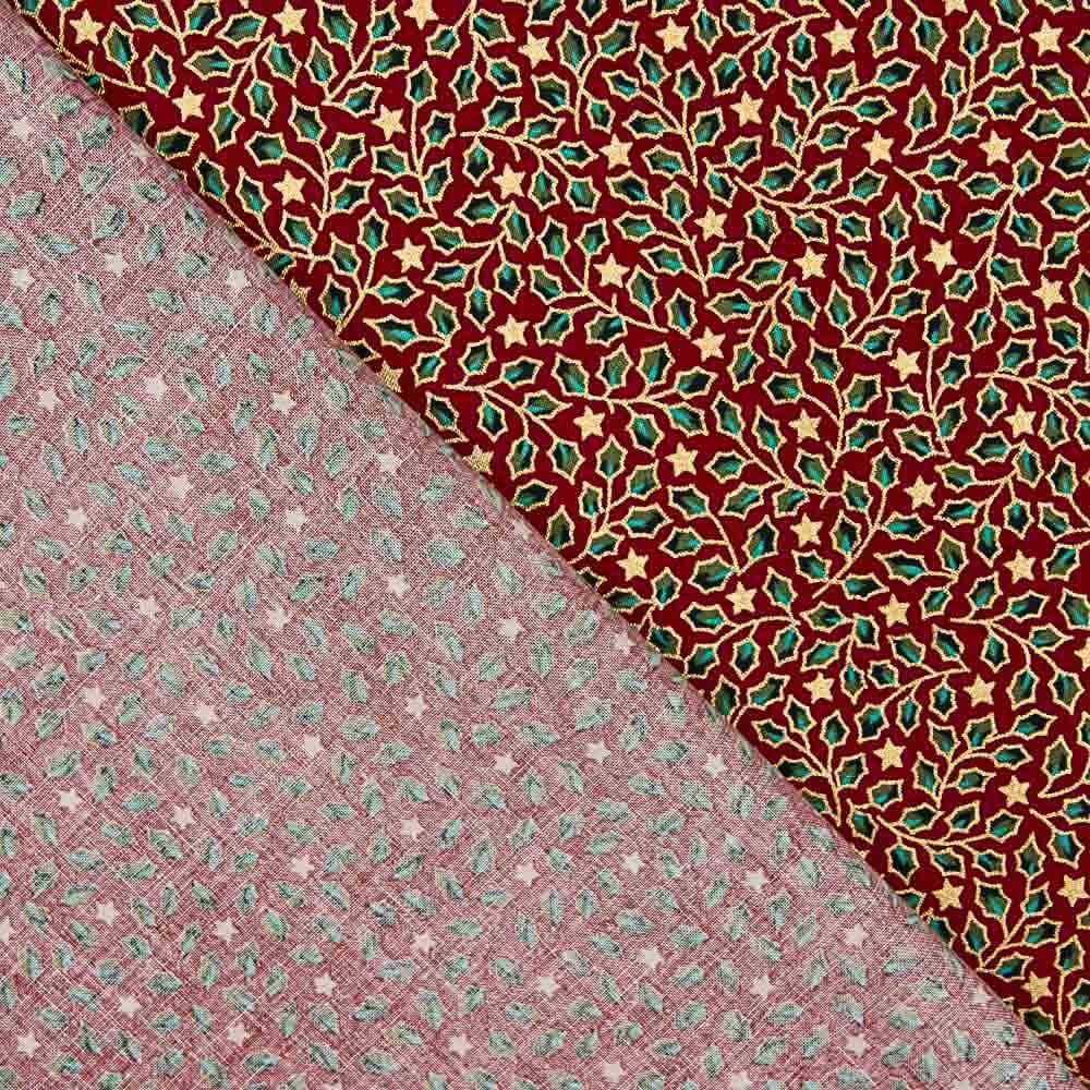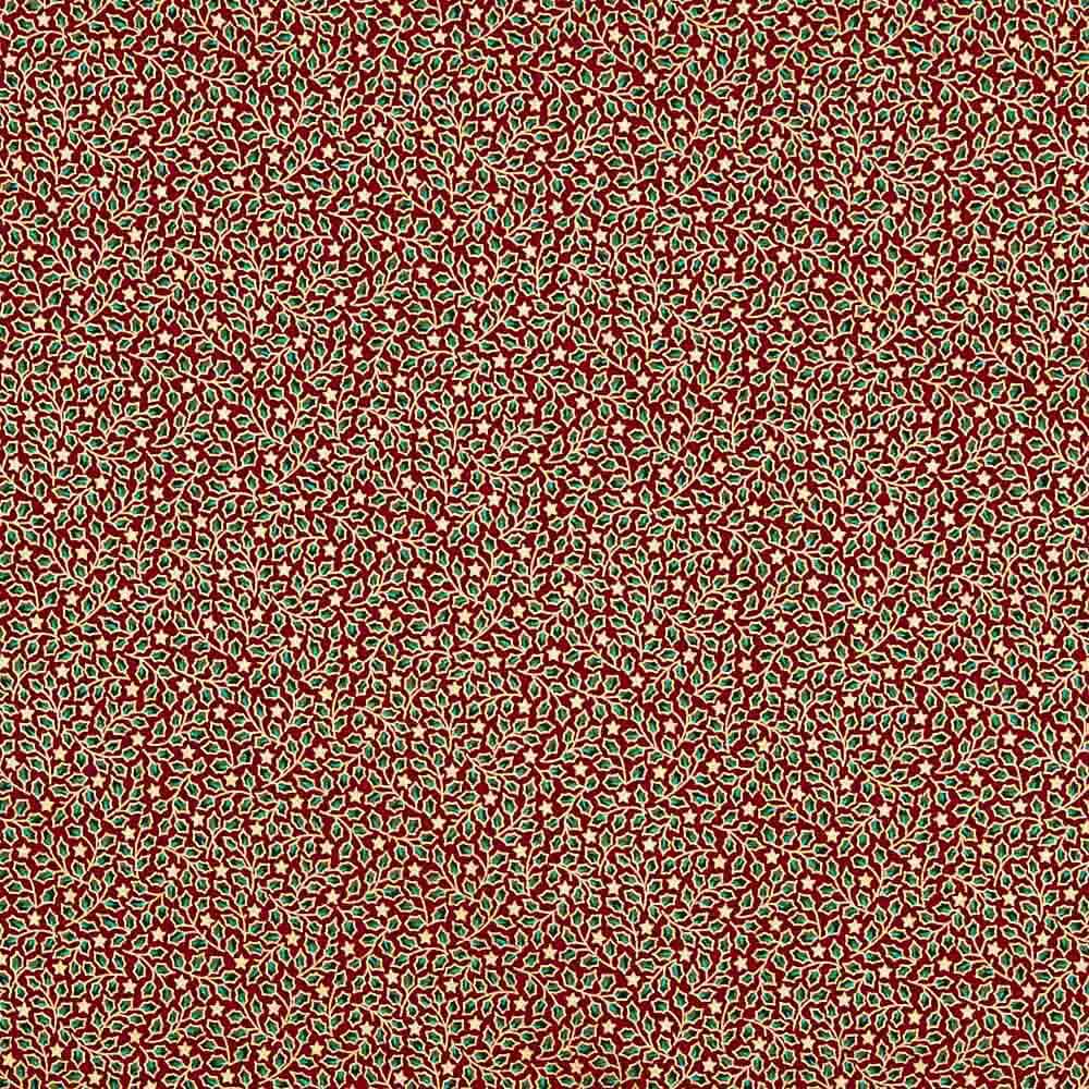 Tissu en popeline de coton avec un imprimé de plantes de gui avec des éclats dorés sur un fond rouge. La popeline est un tissu de coton très polyvalent, doux, fin et soutenu. Ce tissu en coton est parfait pour les décorations de Noël, les nappes et le patchwork.