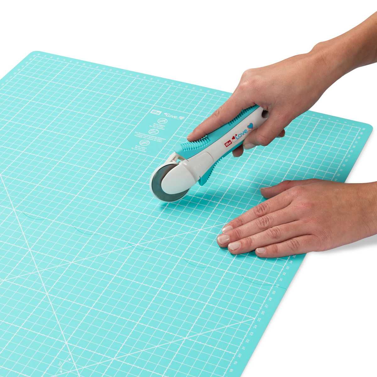 Base de coupe 60cm x 45cm Prym "LOVE" très pratique pour ceux qui ont peu d'espace car une fois plié elle mesure 30cm x 45cm. Spécialement conçue pour être utilisée avec le cutter circulaire "Prym". Ne pas exposer à la chaleur et ne pas plier. Marquée en blanc sur fond turquoise.