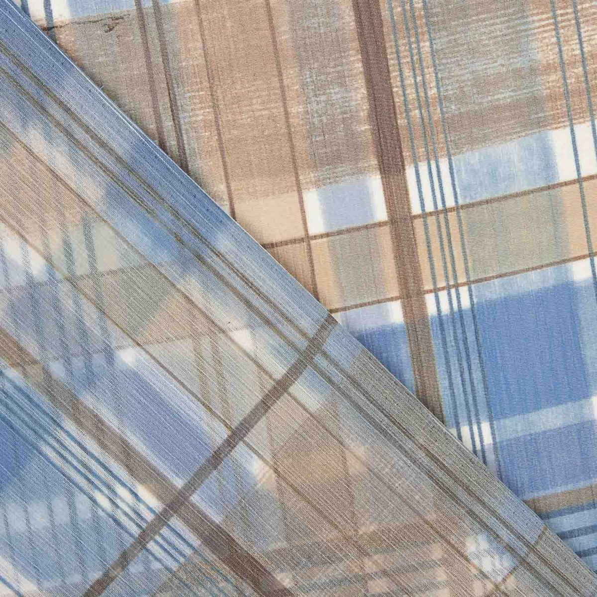 Su diseño de cuadros en tonos azul, beige y marrón aporta un estilo clásico y versátil, perfecto para confeccionar blusas, faldas, vestidos, pañuelos y prendas con vuelo.