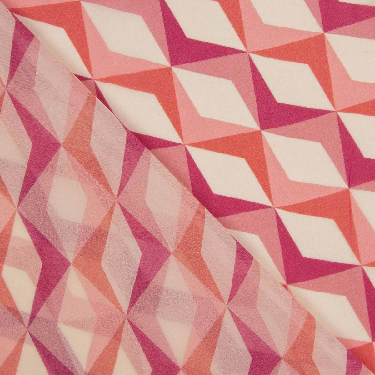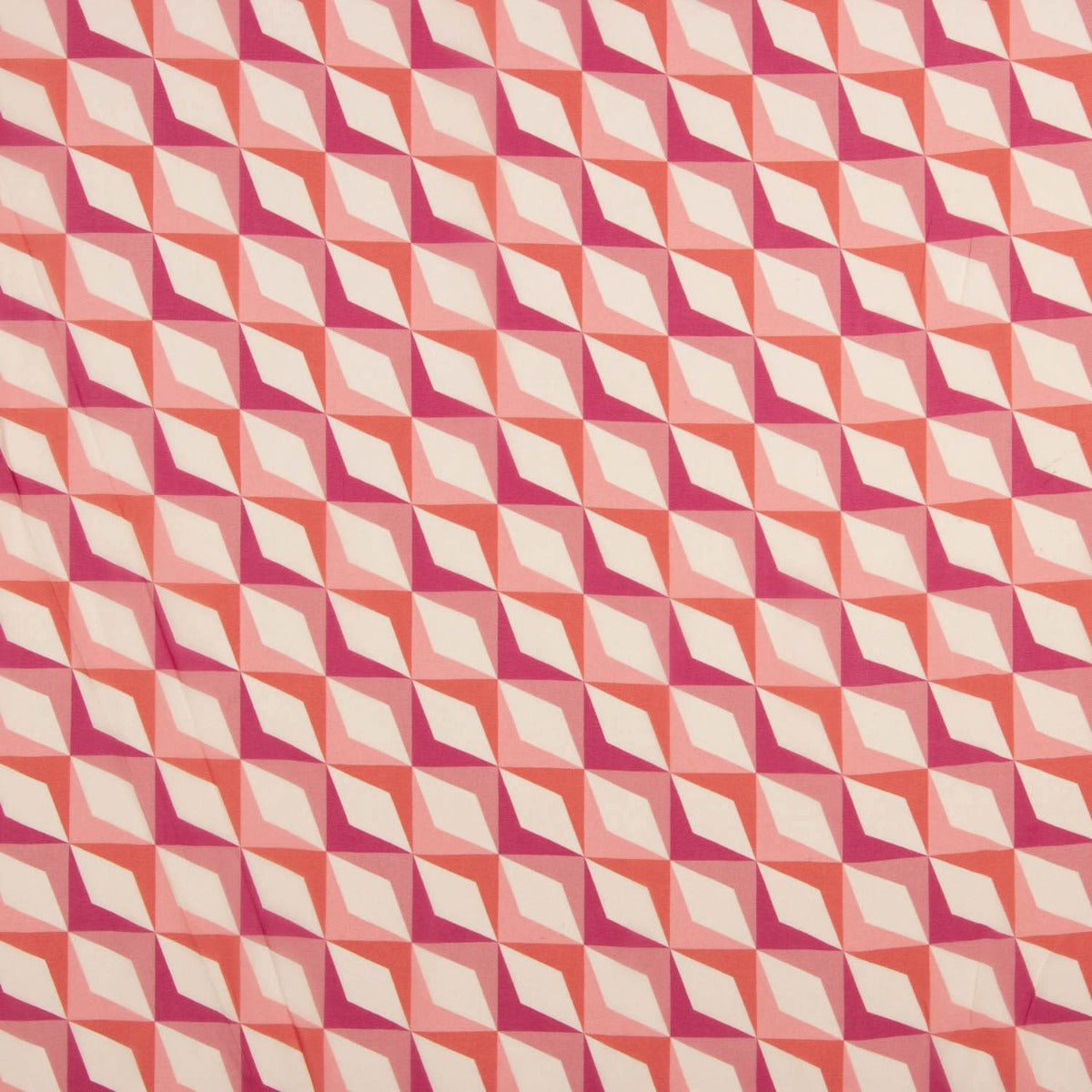 Esta gasa de viscosa 100% es puro dinamismo y estilo retro gracias a su estampado geométrico de rombos en tonos rosas, coral y fucsia.