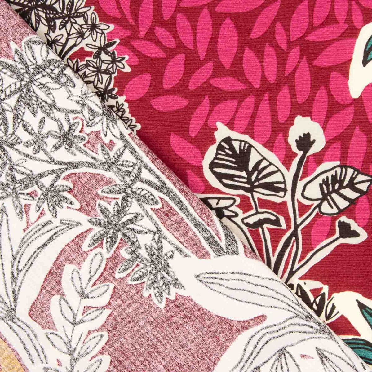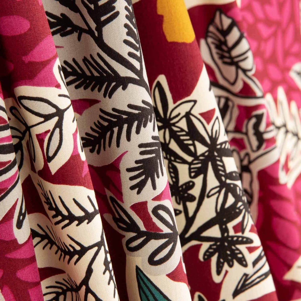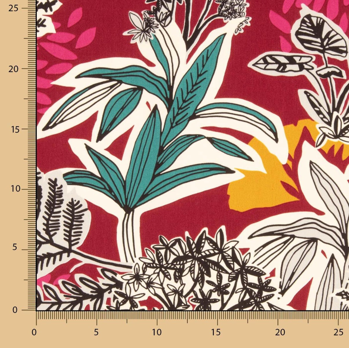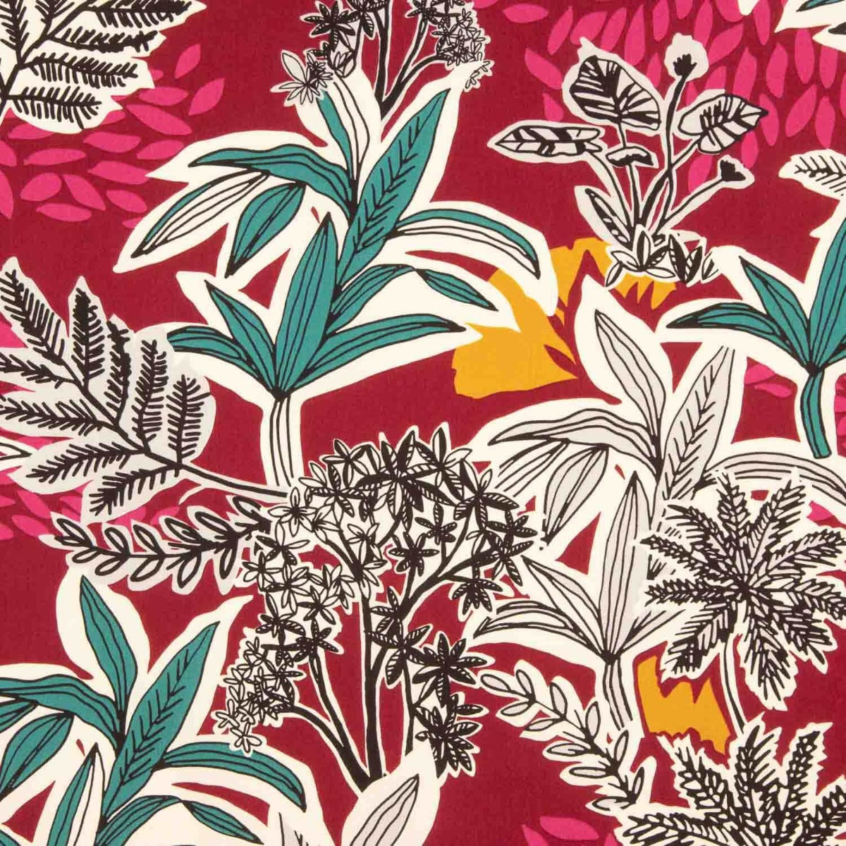 Con un fondo en rojo burdeos vibrante y motivos vegetales en tonos verdes, negros, blancos, fucsias y mostazas, esta tela es una explosión de color y estilo gráfico contemporáneo.