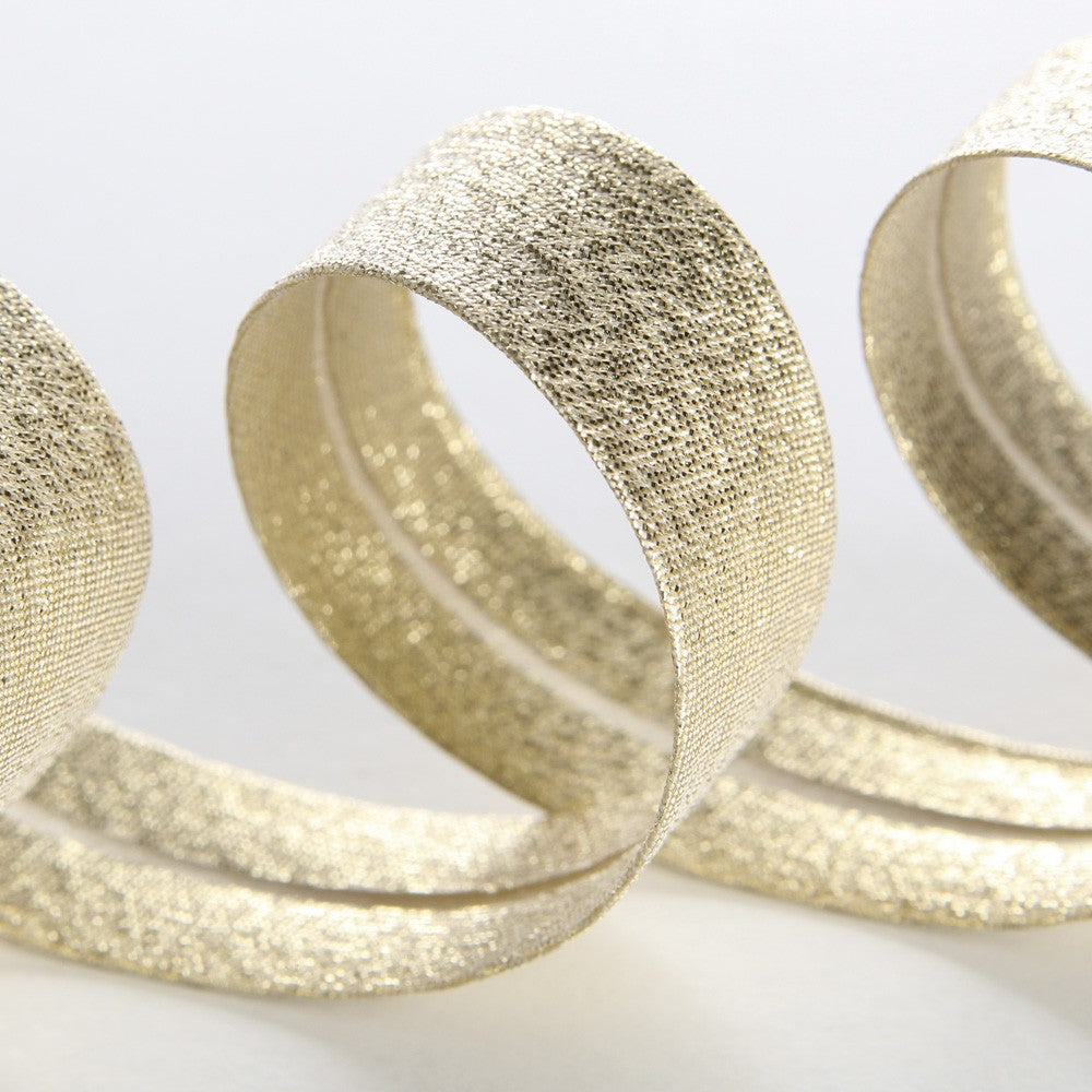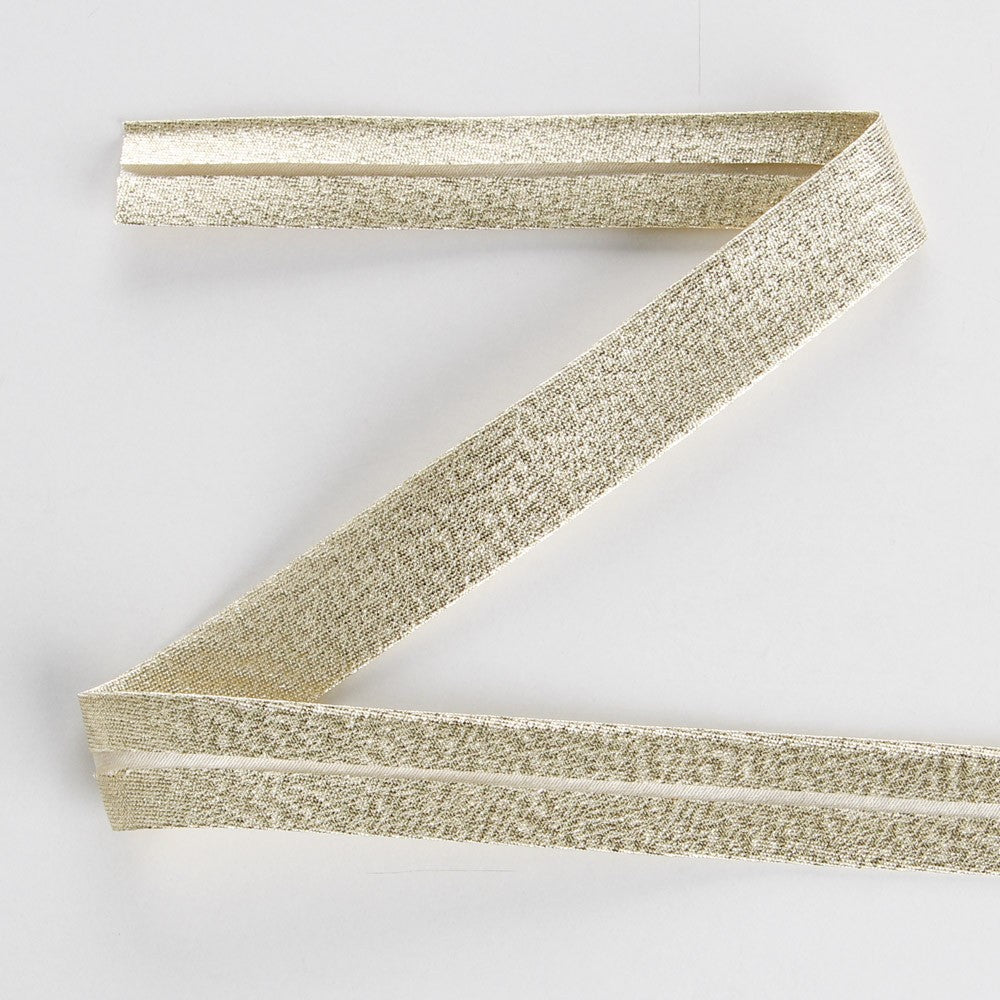 Cinta al bies perfilado en un lamé metalizado en tono dorado en ancho de 18 milímetros, cinta de lúrex para complemento de tus creaciones.