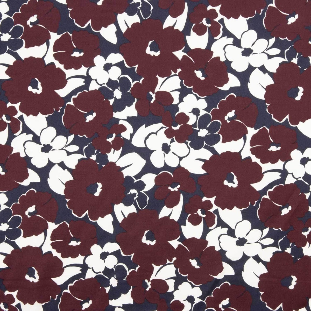 Esta sarga ligera con caída fluida y estampado floral en burdeos, blanco y negro es ideal para prendas con presencia y movimiento.