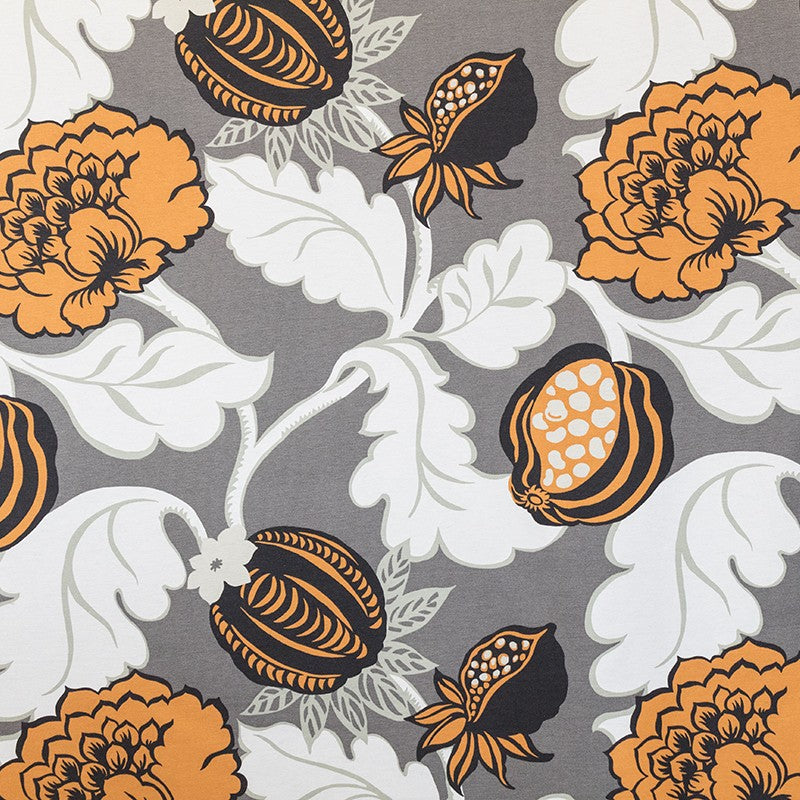 Tissu en ligne en toile pour tapisserie avec un imprimé de fleurs oranges sur un fond gris. Tissu imprimé en coton idéal pour tapisser fauteuils et coussins.