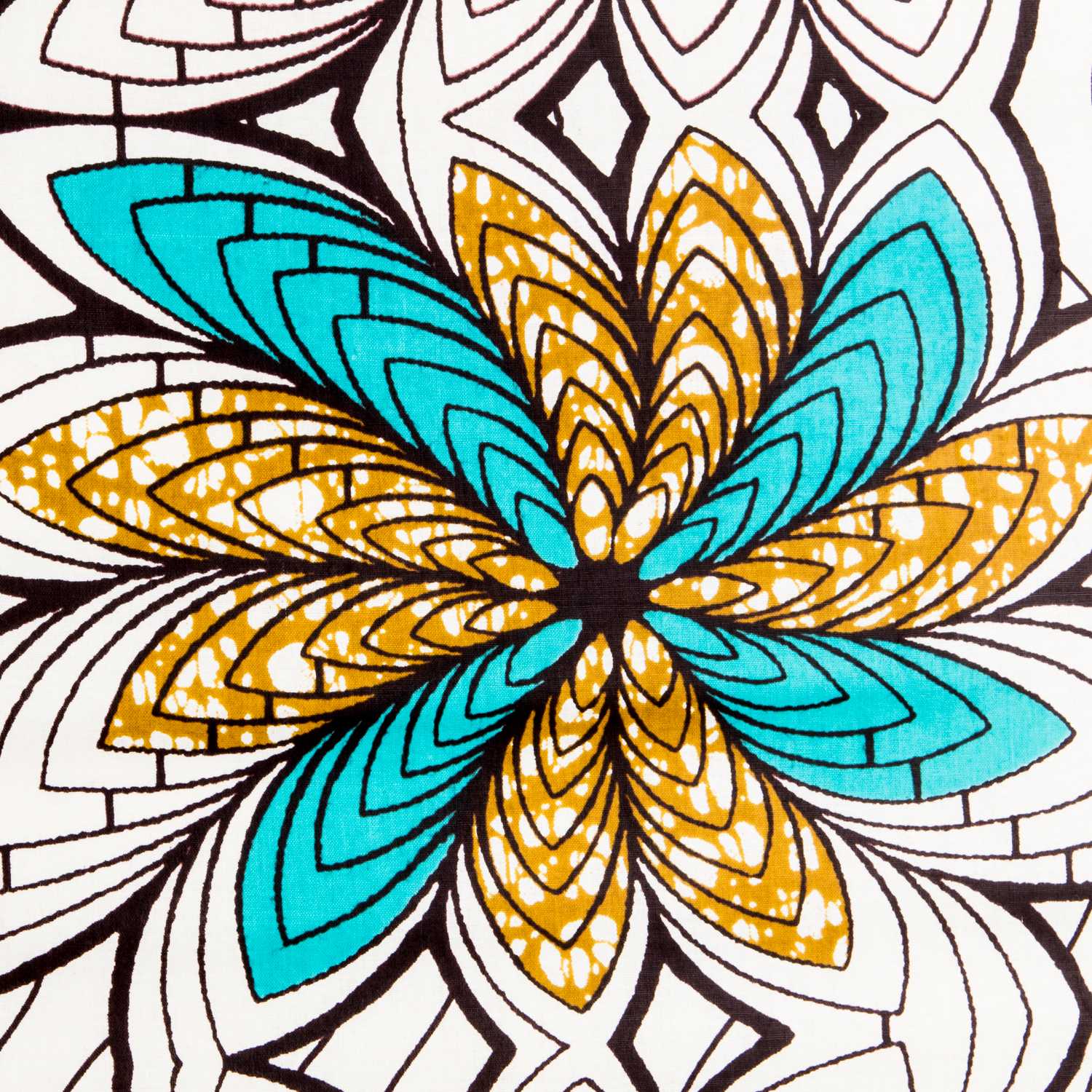 Tissu africain WAX avec spirales écrues et turquoises. Le tissu en coton avec un imprimé de style africain WAX avec une brillance légère et douceur pour ce tissu aussi soutenu, fin et léger. Le tissu WAX est idéal pour confectionner des robes, des sacs, des totebags, robes et chemises d'été, tuniques africaines, sarouels et tout type de décoration de style africain.