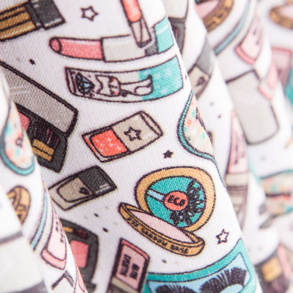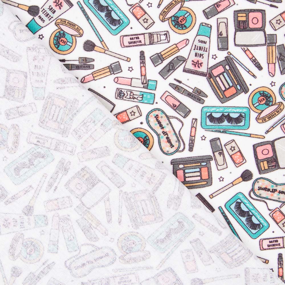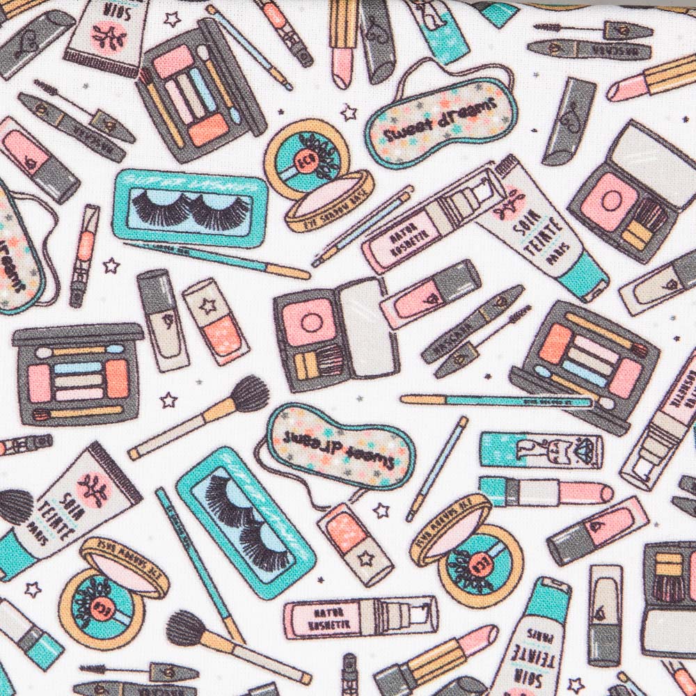 Tissu imprimé de dessins cosmétiques très originaux. Tissu de coton respirant, fin et très doux. La popeline est un tissu de base idéal pour faire des coussins, des draps, faire du patchwork et toutes sortes de décorations. 100% coton, à laver avant de coudre.
