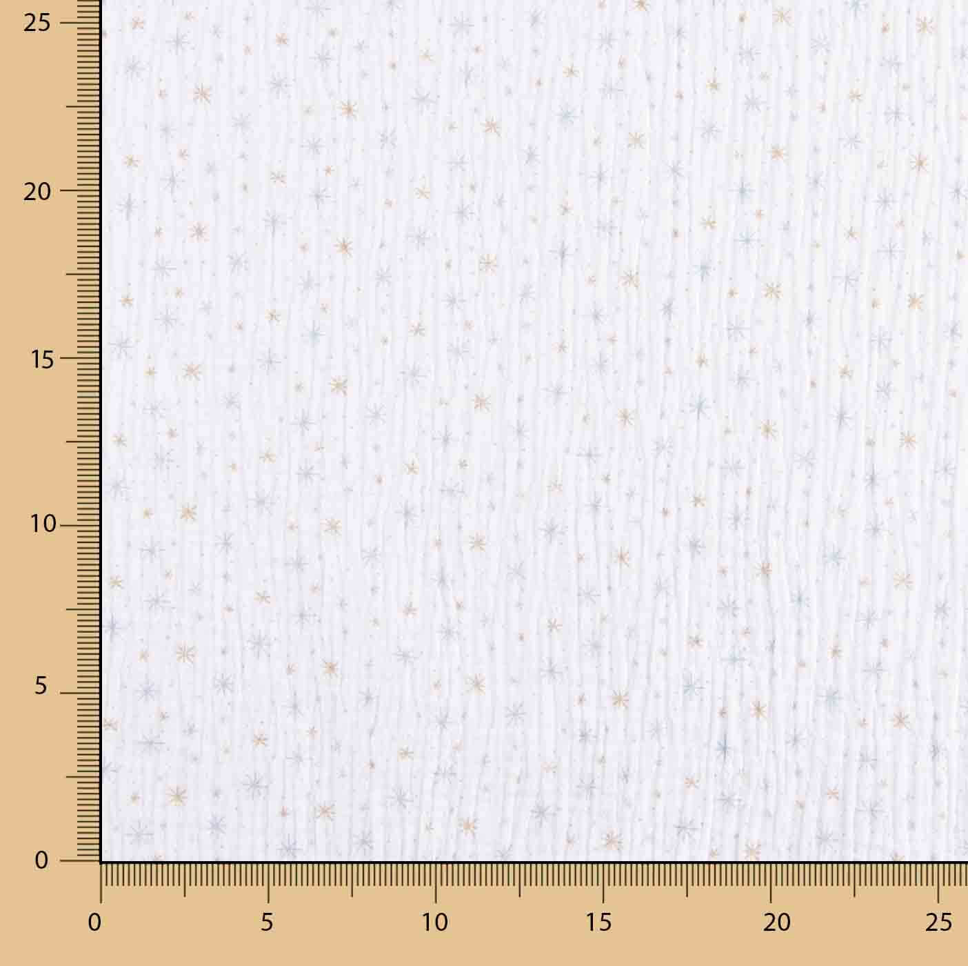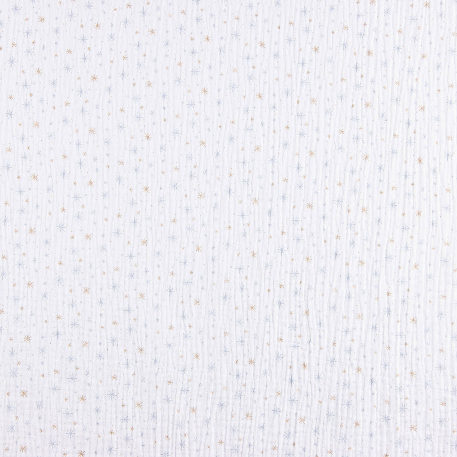 Tissu mousseline (bambula) 100 % coton de 140 cm de large avec un délicat imprimé de petites étoiles dans des tons bleu poudré et moutarde sur fond clair, créant un motif doux, subtil et polyvalent, idéal pour la confection de vêtements pour enfants et d'accessoires.