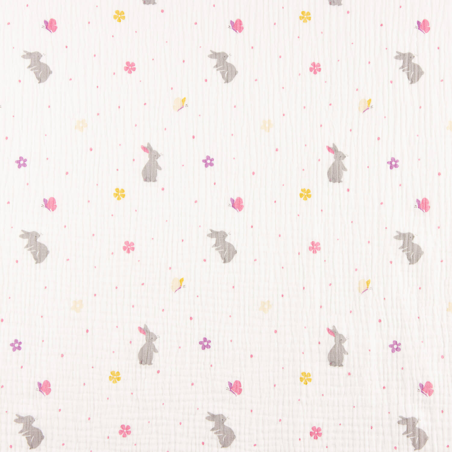 Composition : 100 % coton | Tissu : mousseline / bamboula imprimée | Largeur : 140 cm | Motif : lapins et fleurs | Utilisation : mode enfantine, bébé et décoration