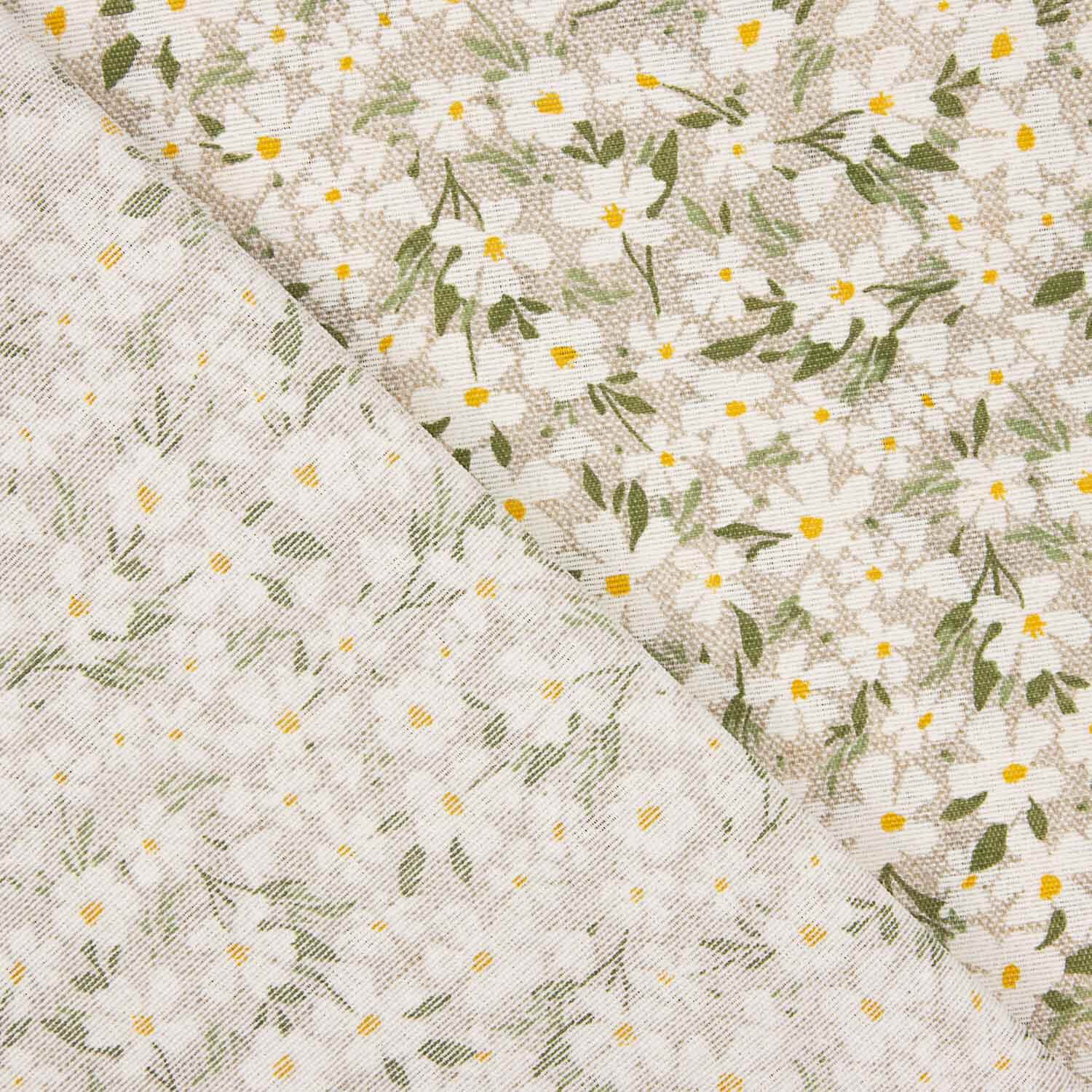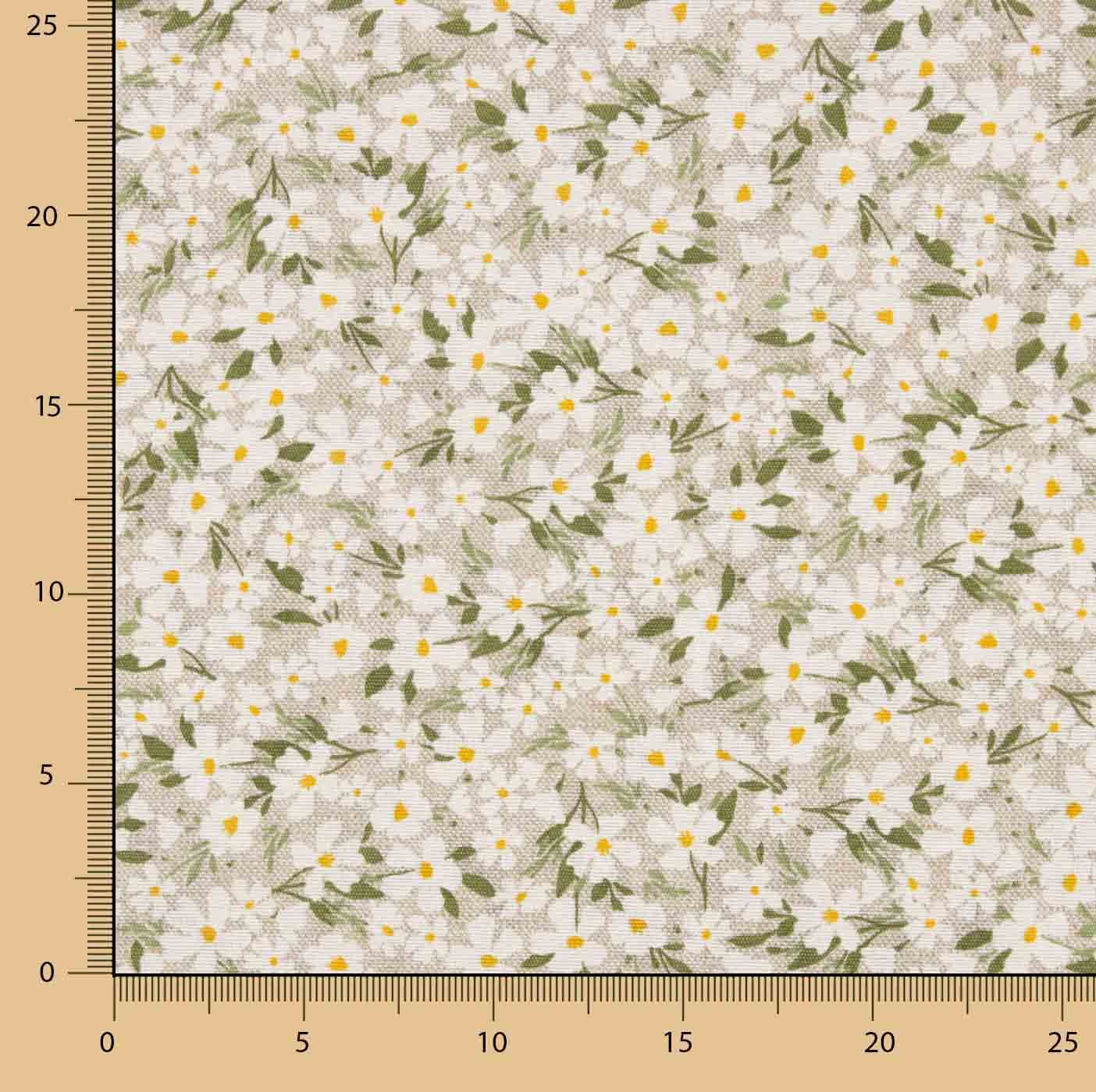 La toile imprimée Margaritas Verde présente un délicat motif imprimé floral composé de petites marguerites blanches au cœur jaune associées à des feuilles dans des tons verts sur un fond neutre, créant un effet naturel, frais et très harmonieux.