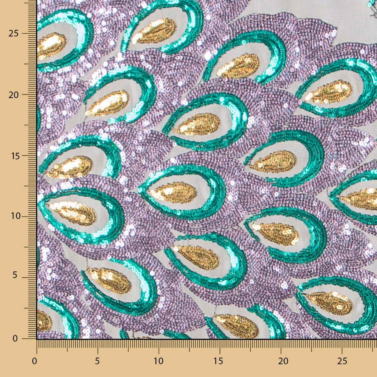 Tissu à paillettes motif plumes de paon mauve sur une base en tulle aux couleurs vives.