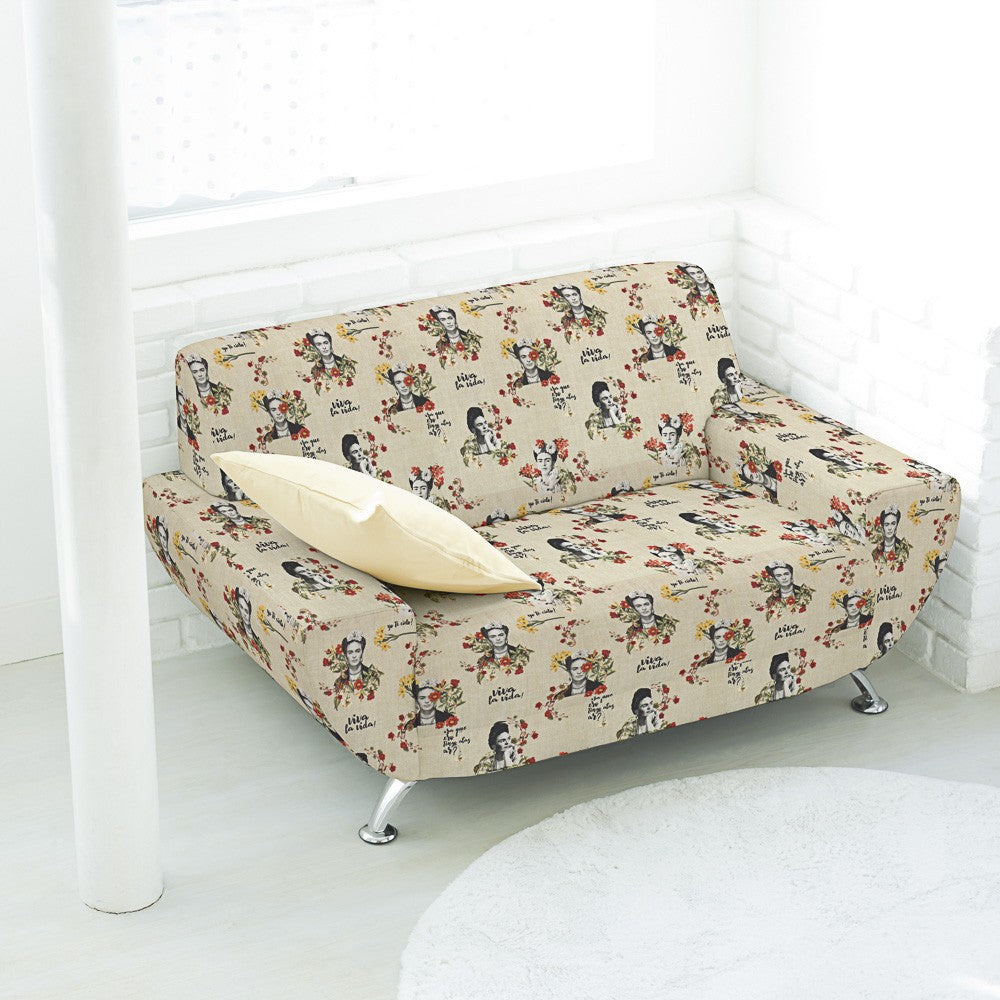 Tela de decoración Frida Kahlo de algodón sobre fondo rústico. La loneta de algodón es una tela opaca, con caída y muy suave. Loneta perfecta para tapizar sillas, sofás, sillones y todo tipo de decoración del hogar. También se utiliza para confección de mochilas, bolsas, bolsos, cojines y colchas.