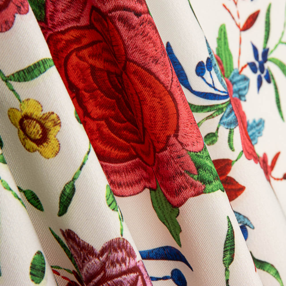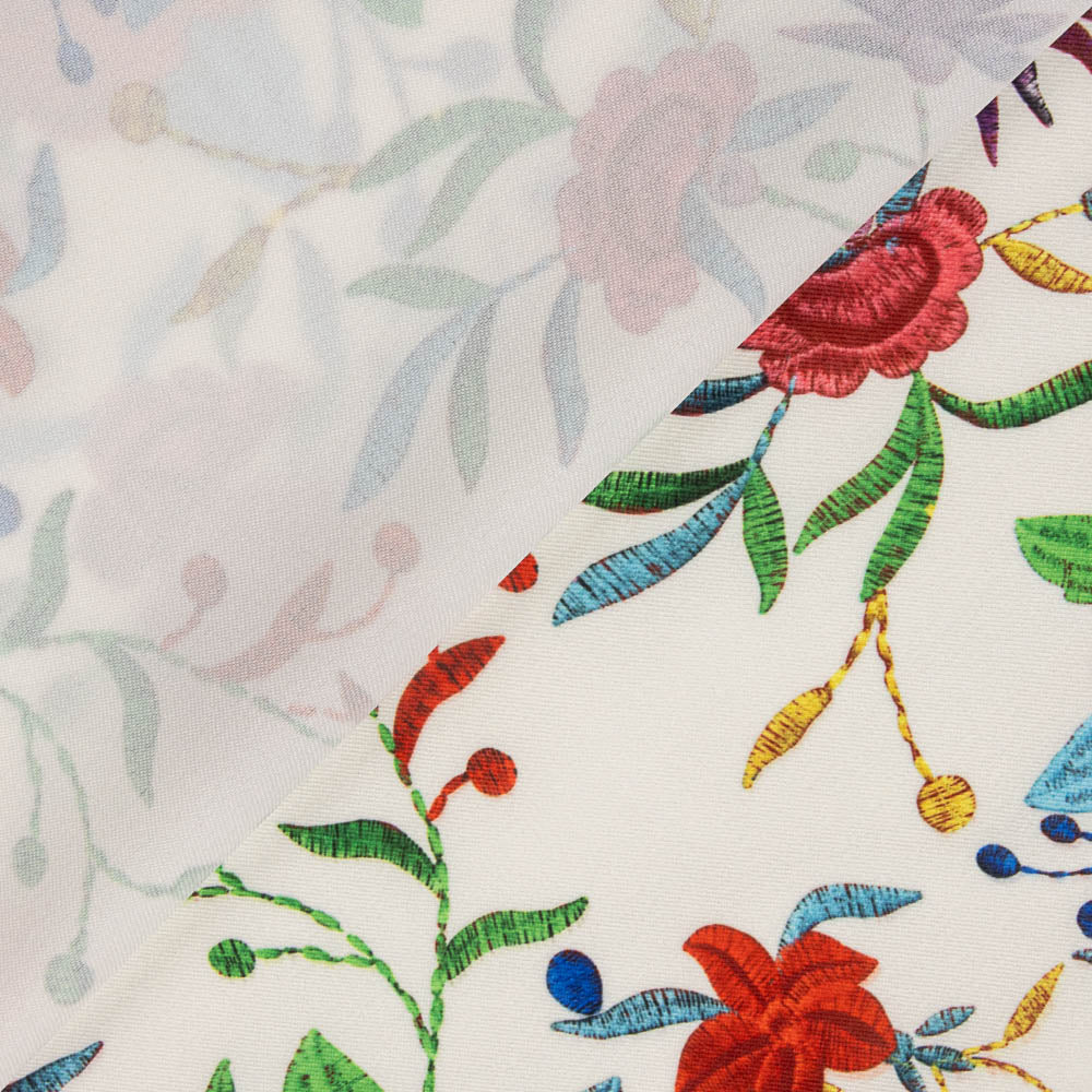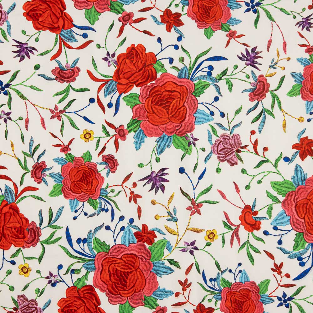 Tissu plat en polyester extensible avec imprimé manille écru. Tissu plat avec 3% d'extensibilité avec une texture très fine et légèrement rugueuse, parfait pour la couture de jupes, pantalons, robes flamenco.