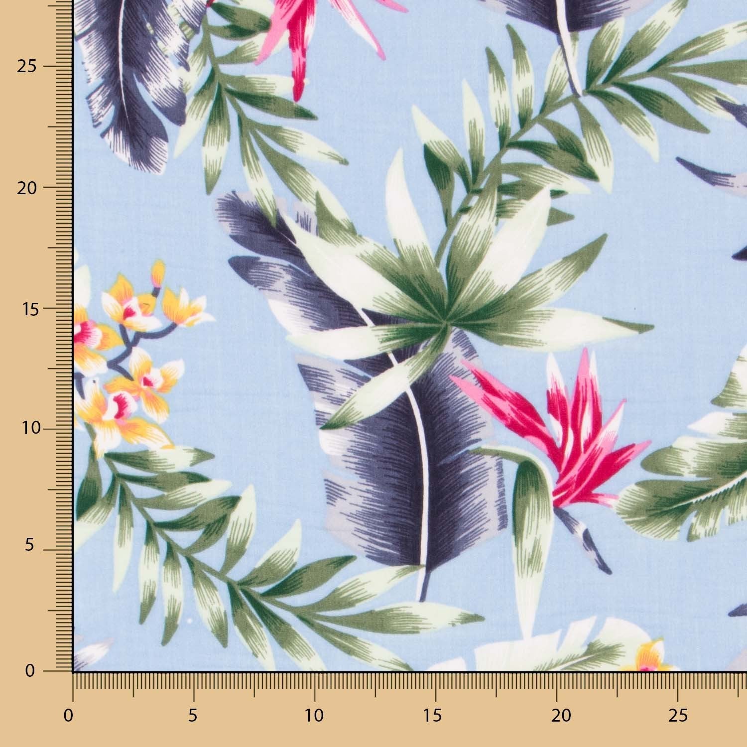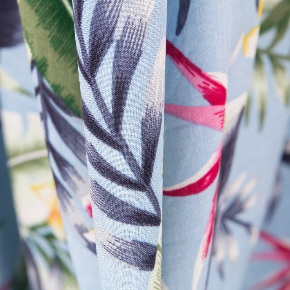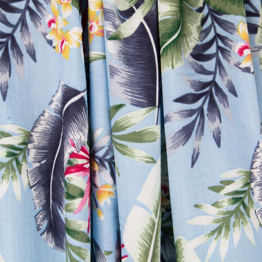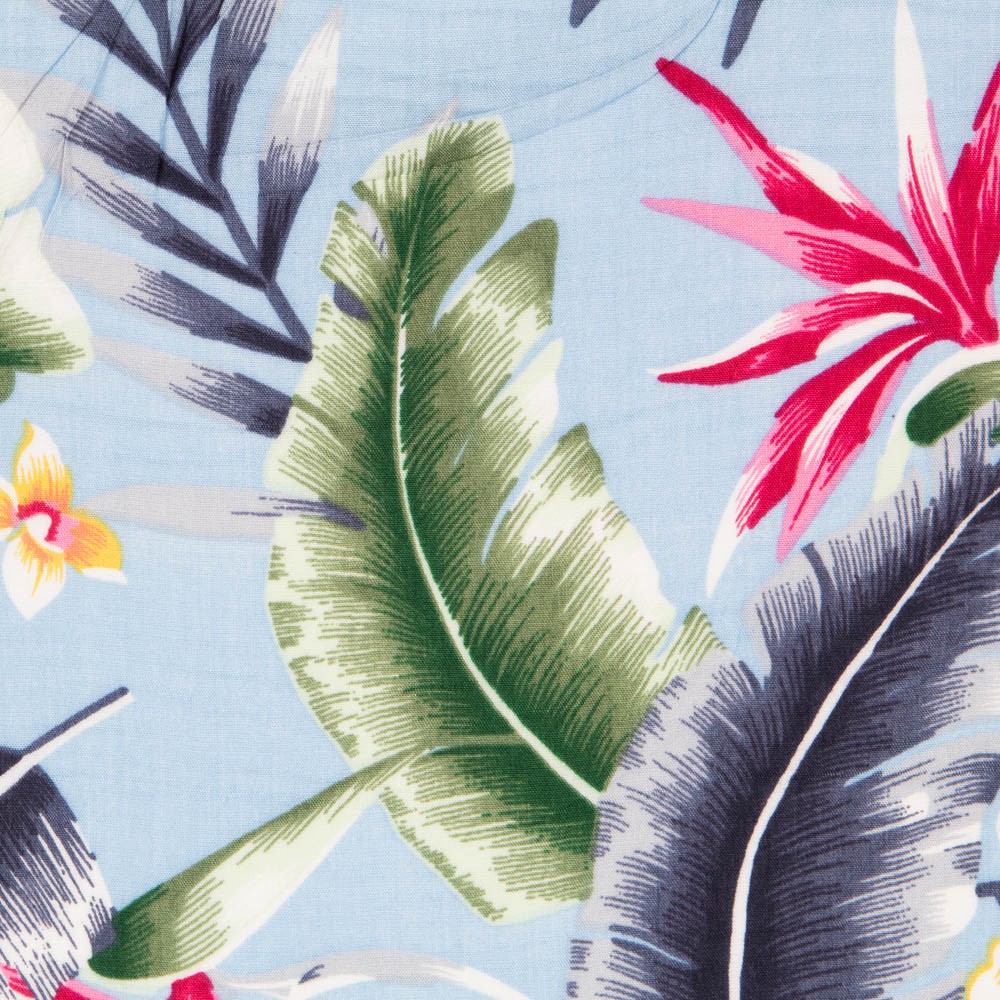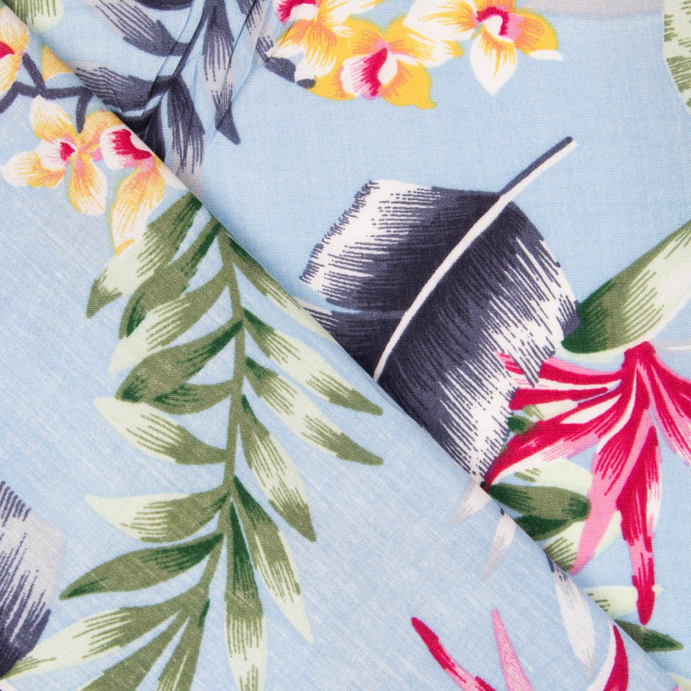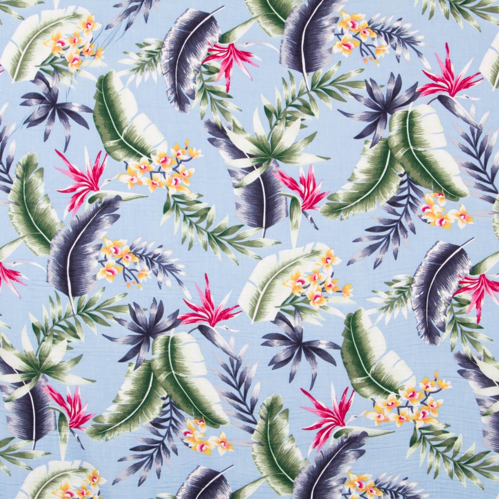 Tela tropical de palmeras sobre fondo gris perla. La viscosa es una tela muy fluida, con vuelo y caída. Tela estampada ideal para confeccionar vestidos, faldas, pantalones y camisas.