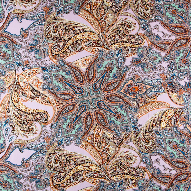 Tissu avec un imprimé de cachemire sur un fond couleur Lavande en Viscose. La viscose est appréciée pour être un tissu très fluide, mince et très doux. Nos tissus viscose bon marché avec lequels vous pouvez faire toutes sortes de robes pour l'été, chemises et jupes sont disponible pour achat en ligne au mètre et au rouleau.