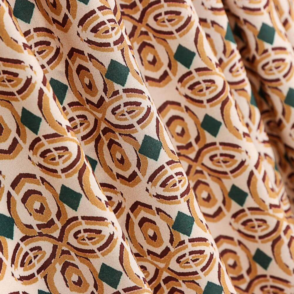 Tela de viscosa estampada con geométrico beige. Viscosa con efecto de acabado de lino es la combinación perfecta de elegancia y confort.