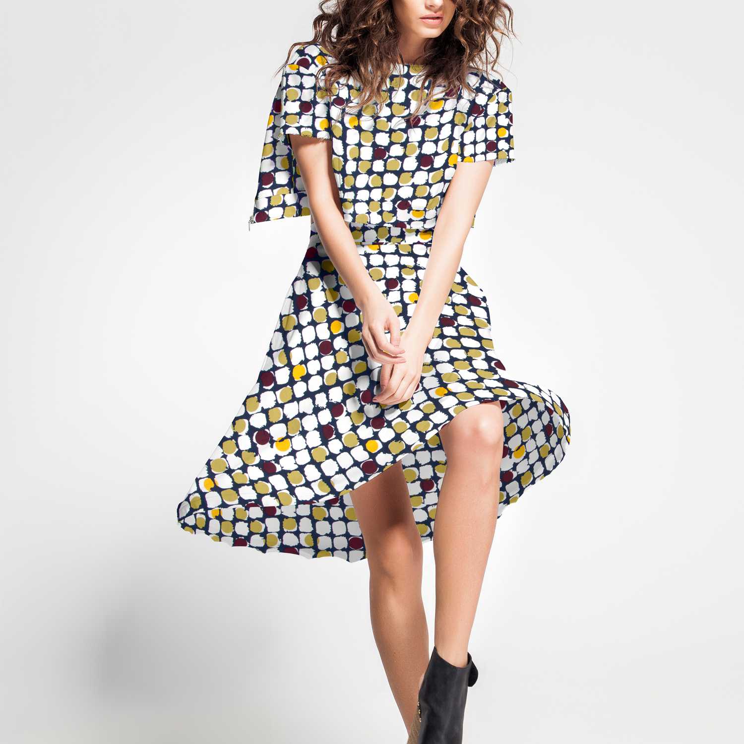Tissu avec un imprimé original en viscose bleu marine pour coudre des robes. La viscose est un tissu très fluide, fin et très doux. Tissu de mode pour toutes les saisons de l'année grâce à sa polyvalence. Imprimé viscose idéal pour les robes, jupes, chemises, vestes et kimonos.