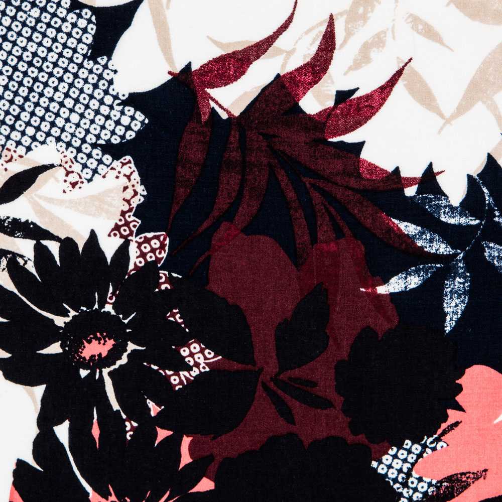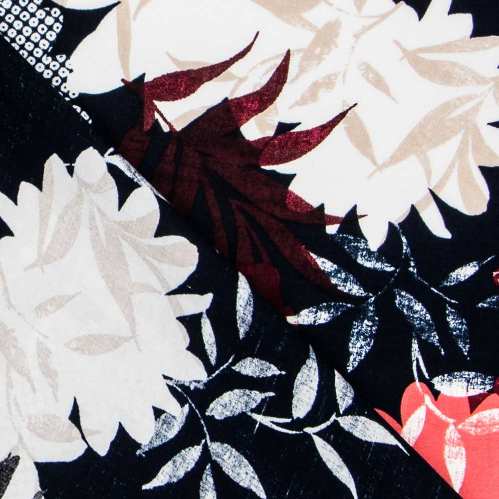 Tissu viscose imprimé de fleurs sur fond bleu foncé. La viscose est un tissu très fluide, fin et très doux. Tissu de mode pour toutes les saisons de l'année grâce à sa polyvalence. Imprimé viscose idéal pour les robes, jupes, chemises, vestes et kimonos.