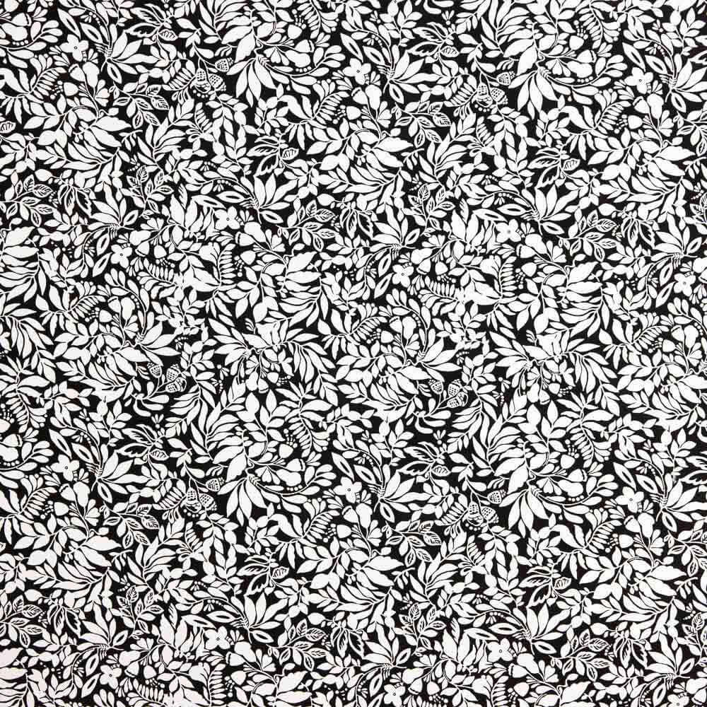 Tissu imprimé en viscose avec des feuilles bicolores noires. Viscose imprimé avec drapé, très fluide et fin. Tissu pour robes, jupes, pantalons, blouses et toutes sortes de vêtements de mode. Comme il s'agit d'un tissu 100% viscose, nous recommandons un lavage avant manipulation.