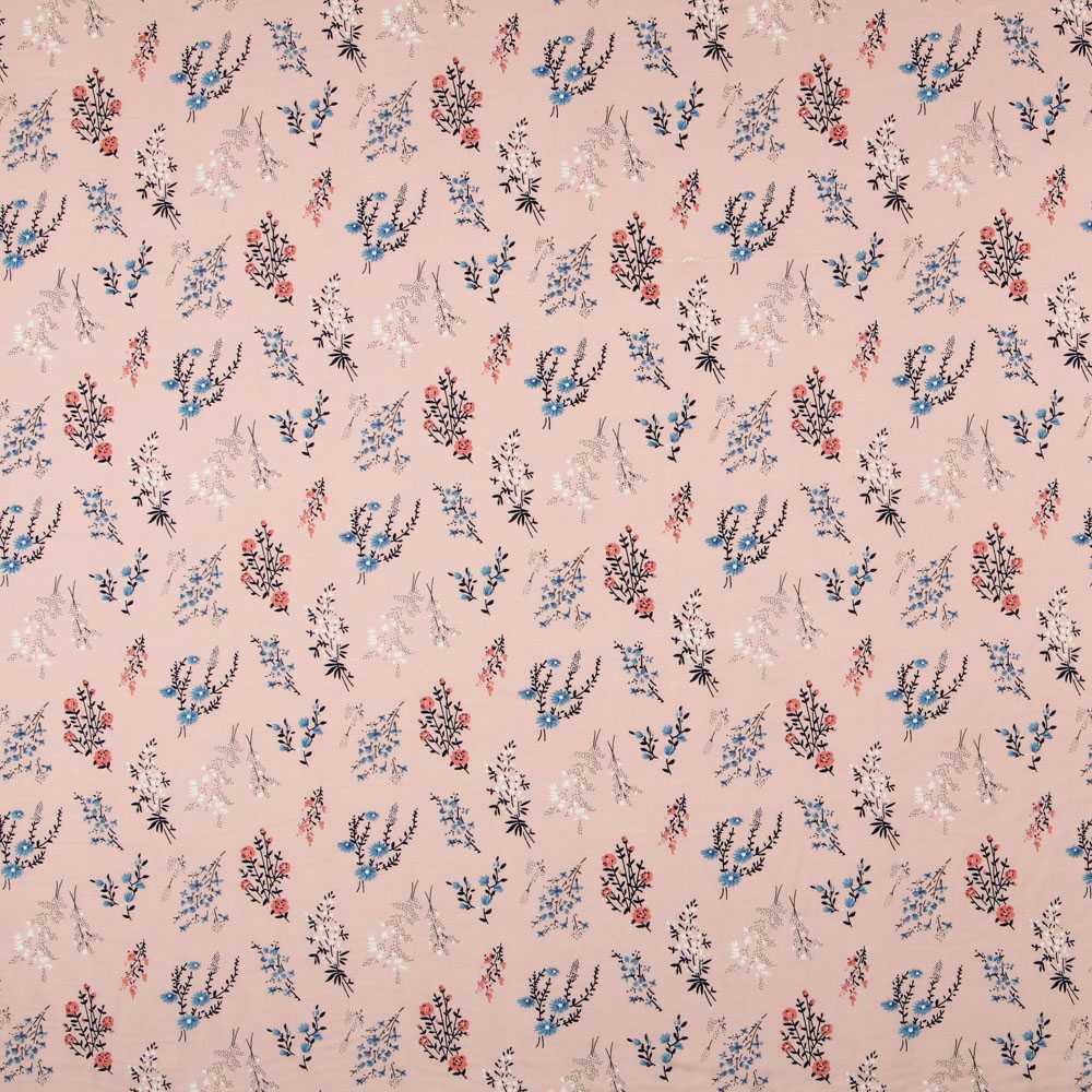 Tissu viscose au mètre imrimé de motifs floraux sur fond rose. La viscose est un tissu très fluide, fin et très doux. Imprimé viscose idéal pour les robes, jupes, chemises, vestes et kimonos.