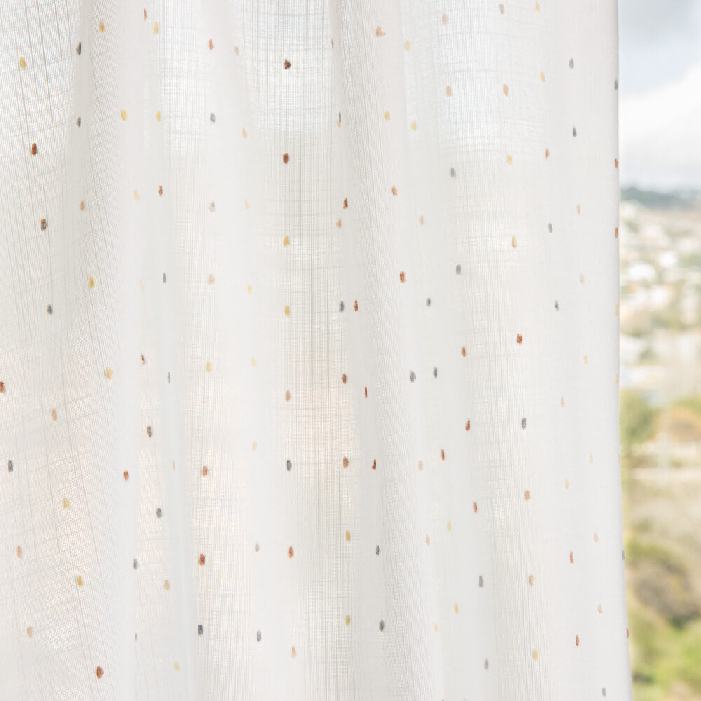 Tela de visillo con plumeti multicolor modelo Universe para habitación infantil. Tela visillo con bajo acabado en cinta de plomo de color blanco estilo etamin. Tela de poliéster 100% en un práctico ancho de 280cm. Es una tela de visillo translúcida con buena caída para confección de cortinas. Debido a su composición, es un tejido de muy fácil mantenimiento. No encoje y puedes lavarla a máquina a 30º con un centrifugado suave. Si cuelgas las cortinas húmedas, con el propio peso quedarán perfectas sin necesidad de planchado. Se recomienda no utilizar suavizante. No admite secadora. La tela ya viene acabada en uno de los orillos del ancho con un cordón de plomo, que sirve de peso, listo para utilizar como final del bajo de tus visillos. para decoraciones de Hogar.