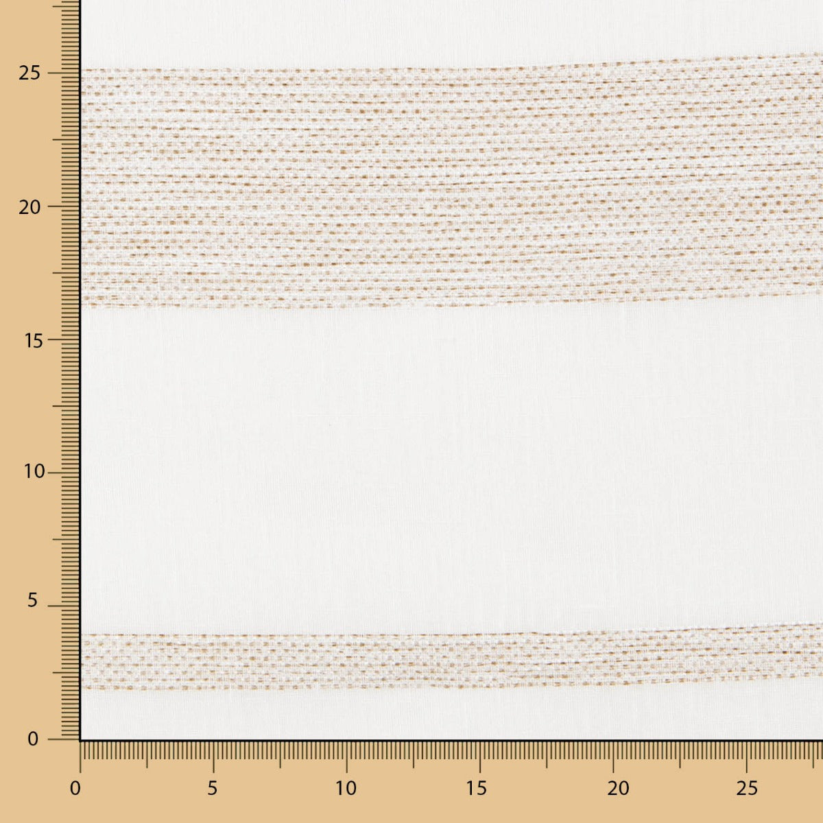 Tissu voilage blanc avec plusieurs bandes dans de ton marron. Tissu semi-translucide pour la fabrication de rideaux d'une hauteur de 280cm. Facile à entretenir car il peut être lavé à la maison et ne se froisse pas (ne pas utiliser d'adoucissant et laver à basse vitesse, ne pas sécher en machine). Vérifiez auprès de notre service commercial les images nécessaires pour différents types de rideaux: panneau japonais, planches, ruban de curling, etc.