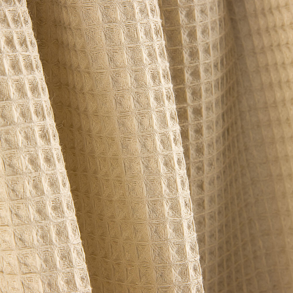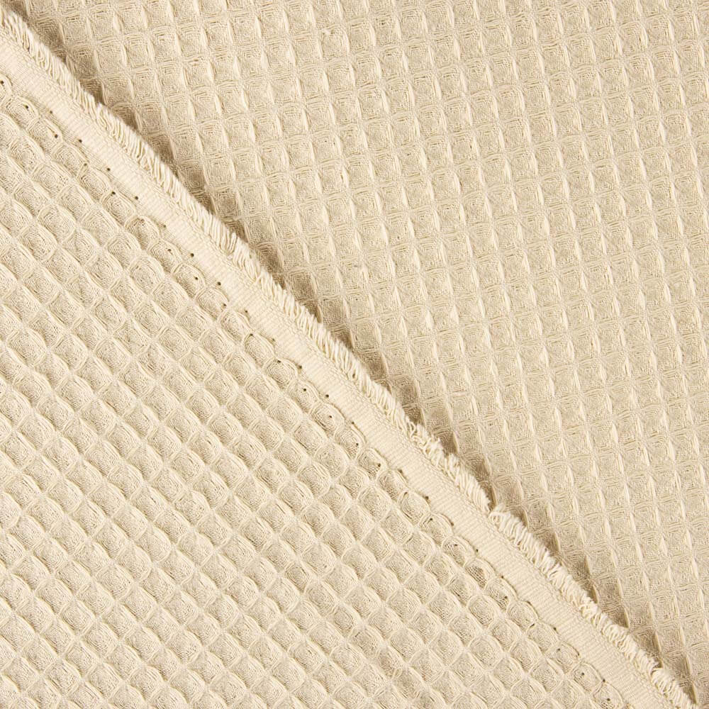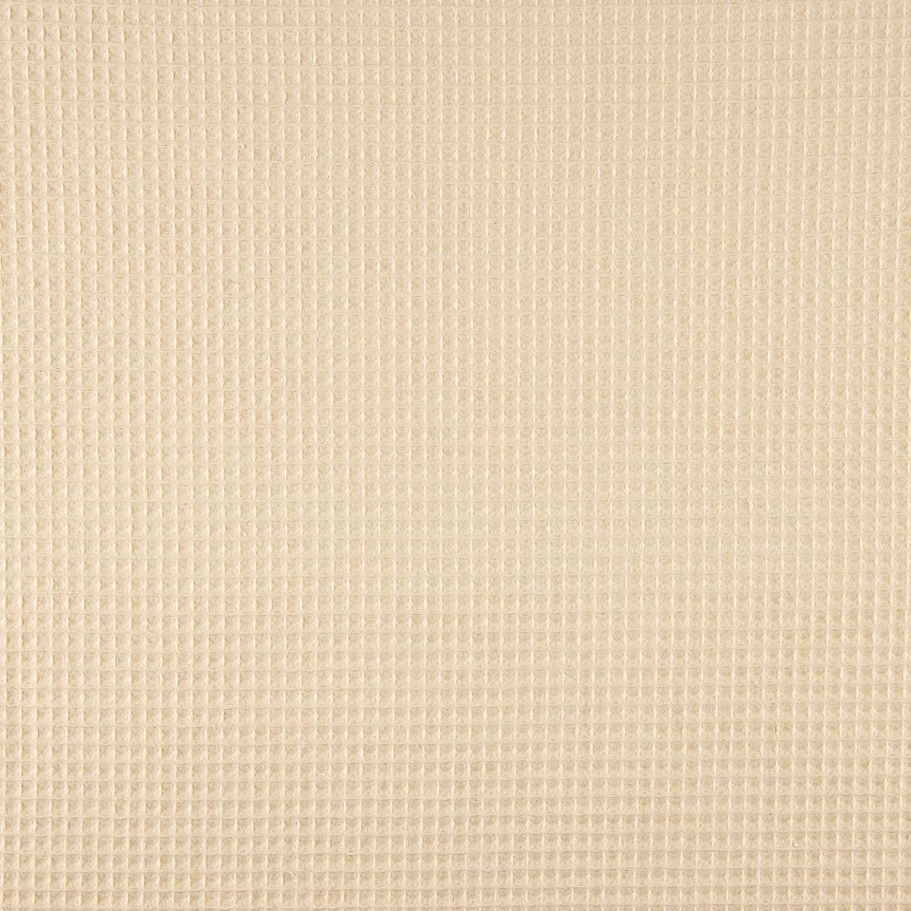 Tela piqué Waflle para hogar y bebé color arena. Tela también conocida como toalla piqué, por los cuadraditos en relieve que componen el tejido. Tiene el cuerpo y peso ideal para colchas de verano, arrullos y complementos para bebé. Tela muy dulce debido a su composición de algodón, pudiéndose utilizar como saco de carritos para bebé y colcha de verano.