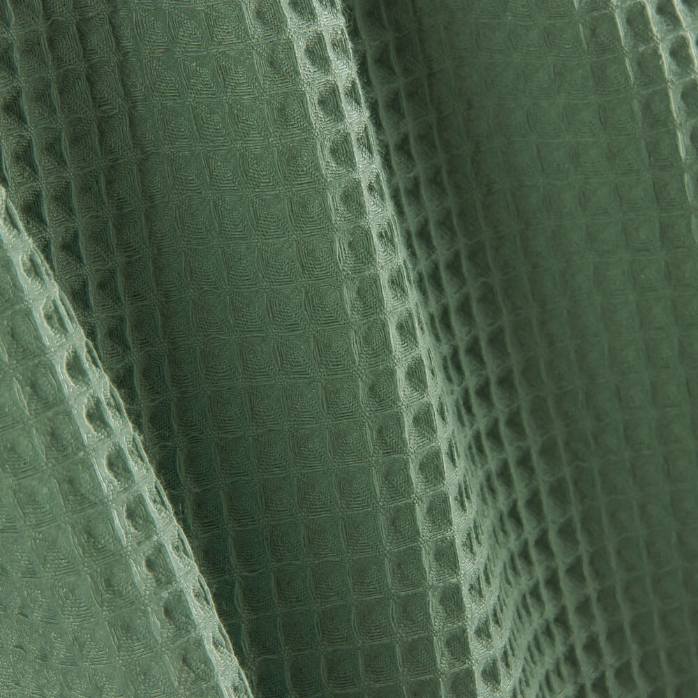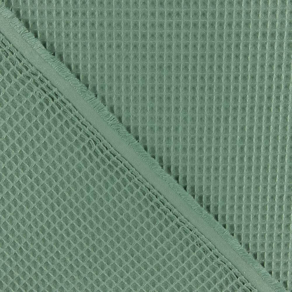 Tela piqué Waflle para hogar y bebé color verde salvia. Tela también conocida como toalla piqué, por los cuadraditos en relieve que componen el tejido. Tiene el cuerpo y peso ideal para colchas de verano, arrullos y complementos para bebé. Tela muy dulce debido a su composición de algodón, pudiéndose utilizar como saco de carritos para bebé y colcha de verano.
